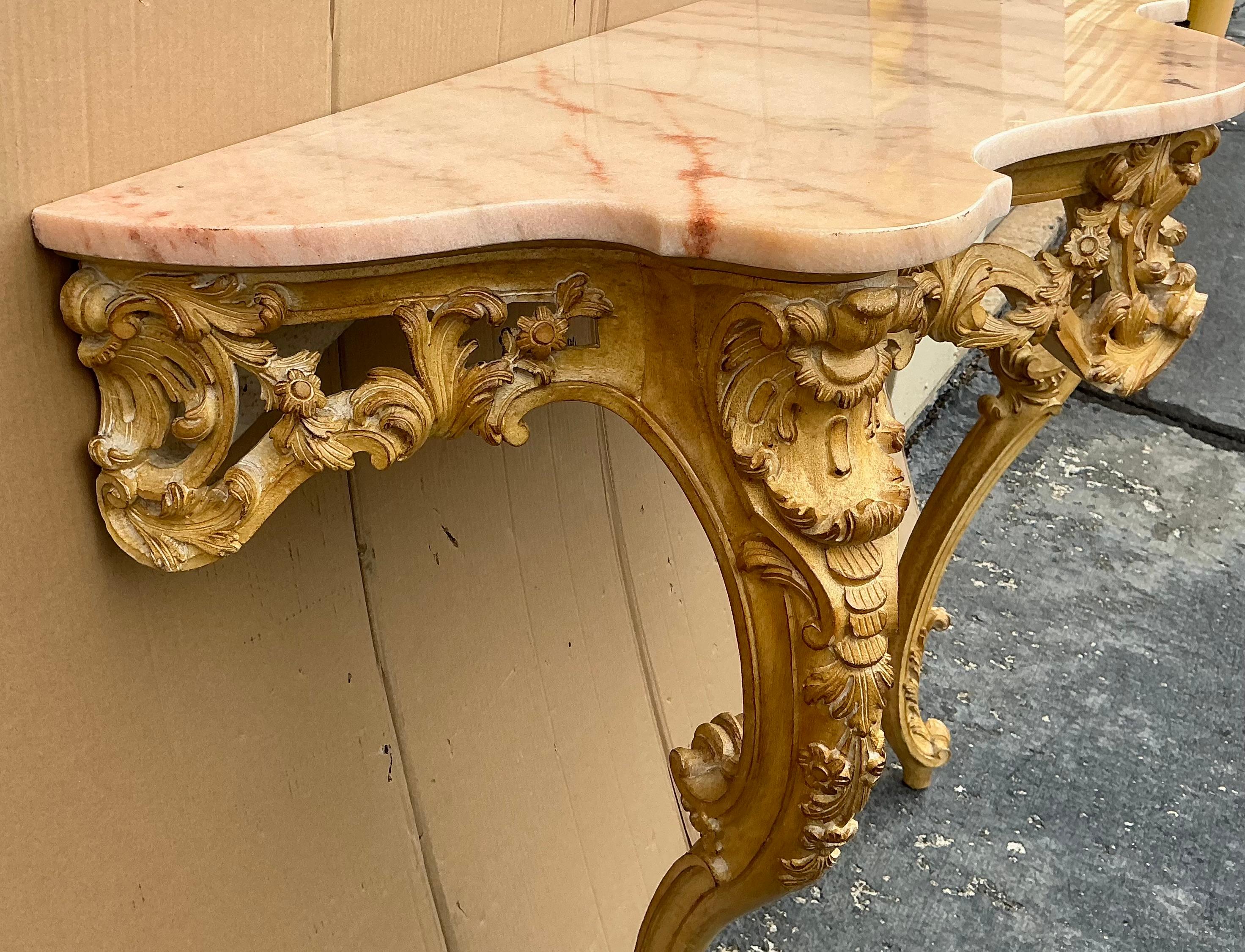 This is a Louis XIV heavily carved pine console table with a pink marble top. It is wall mounted. The piece is Italian and most likely dates to the 60s.