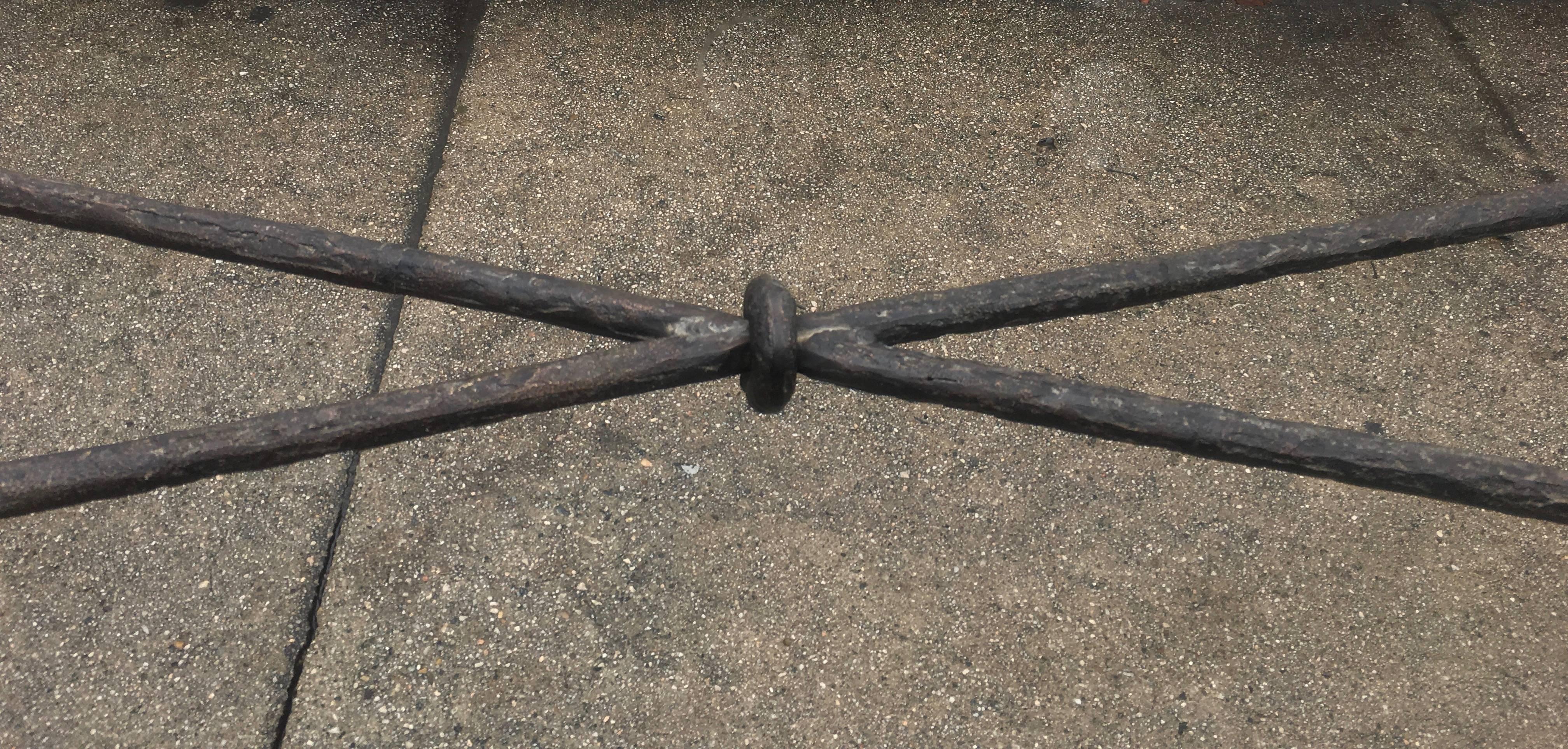 Sculptural Etruscan hand forged and hammered iron frame console table with excellent scale and form.
