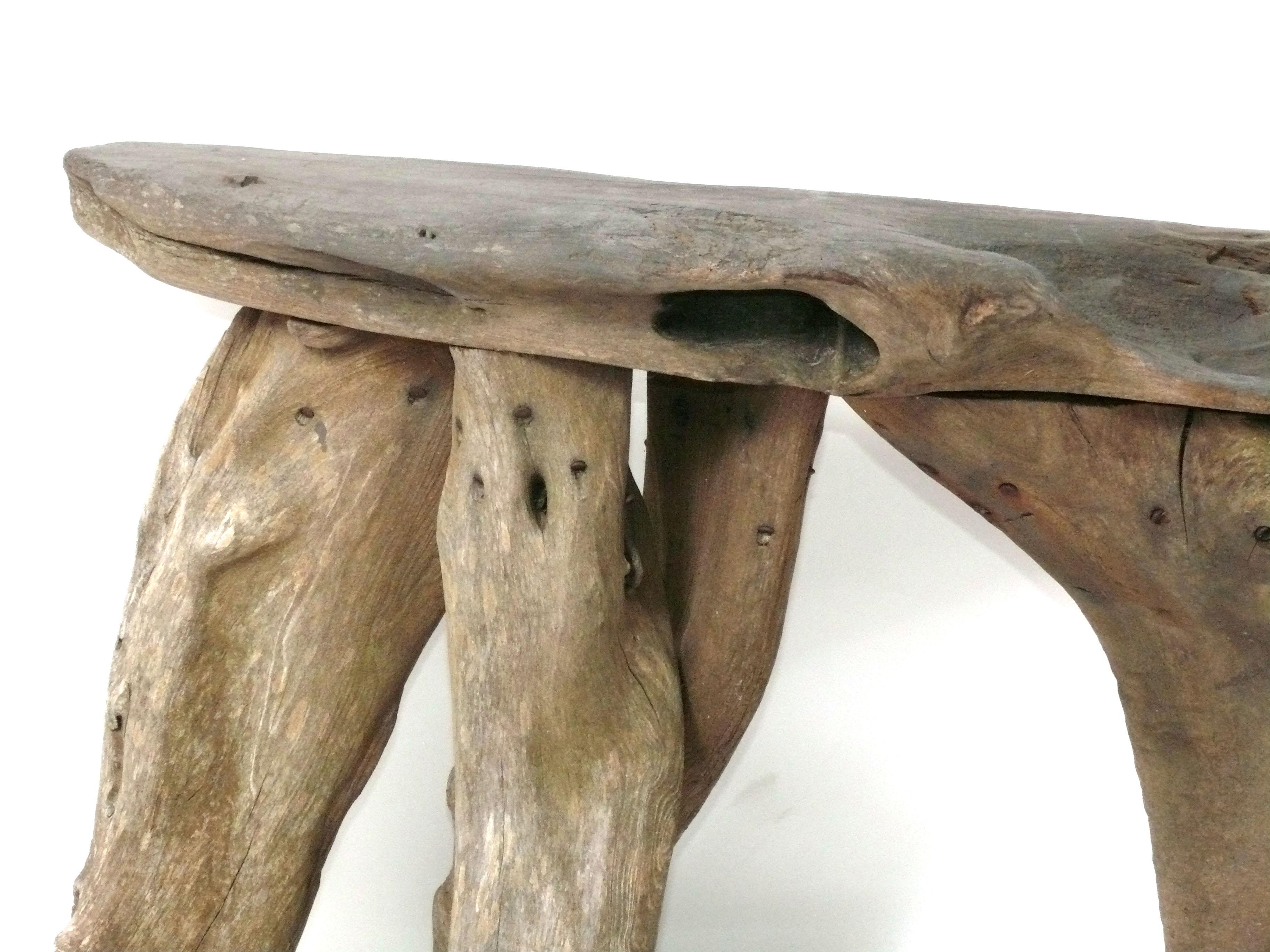 Sculptural Driftwood Console Table, American, 1950s. Organic modern vibe. It was purchased from an artist's studio in the Hamptons in the 1980s and appears to have lived at least some of it's life outdoors and retains it's wonderful weathered patina.