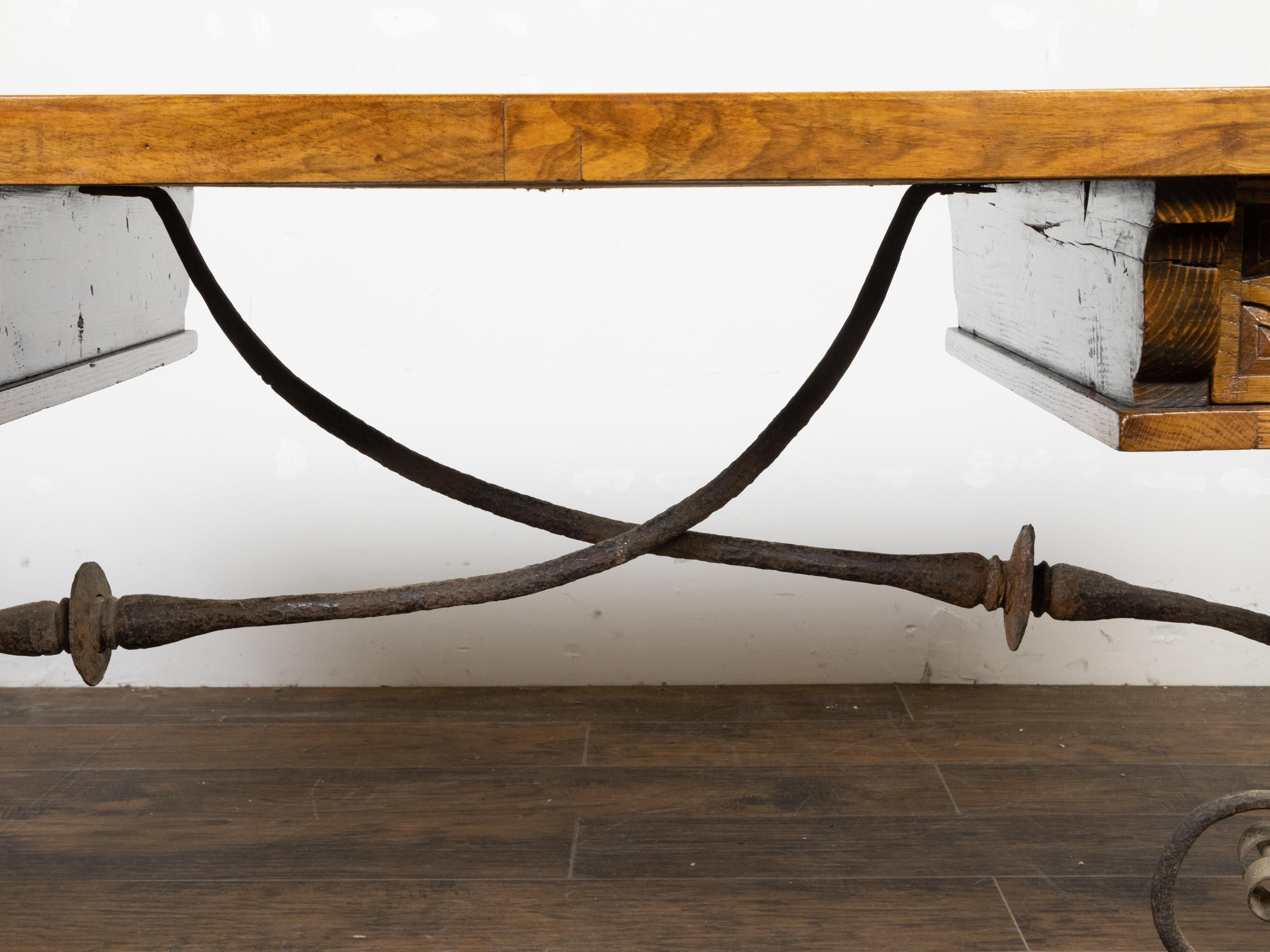 Beautiful antique early 19th-century Spanish Baroque desk, writing table or console, made of solid walnut wood with lyre legs joined by wrought iron stretchers, and featuring two dra...