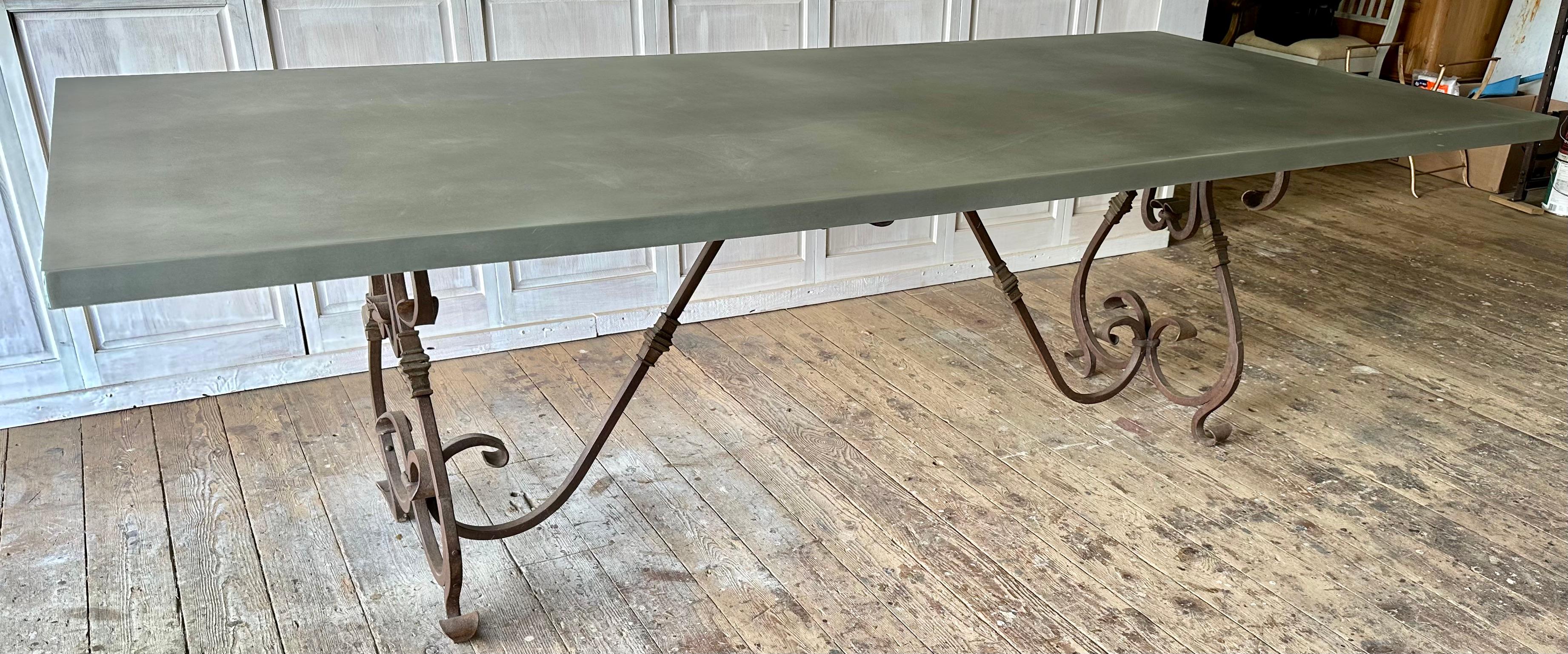 Highly decorative iron metal base with brass decorations topped with a large zinc clad rectangular table top. Table can be used as indoor, outdoor, garden or great room. Rust can be removed and be given a wonderful finish. Elegant and rustic at the same time, the French Baroque style hand-forged iron trestle base features two lyre-shaped legs adorned with a weathered rust finish, connected to the underside of the top with a curved stretcher. A perfect breakfast room table.