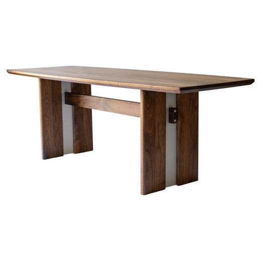 Dining table in quarter sawn walnut featuring a trestle base, carefully constructed utilizing interlocking joinery and without metal hardware or screws. The construction of this tabl...