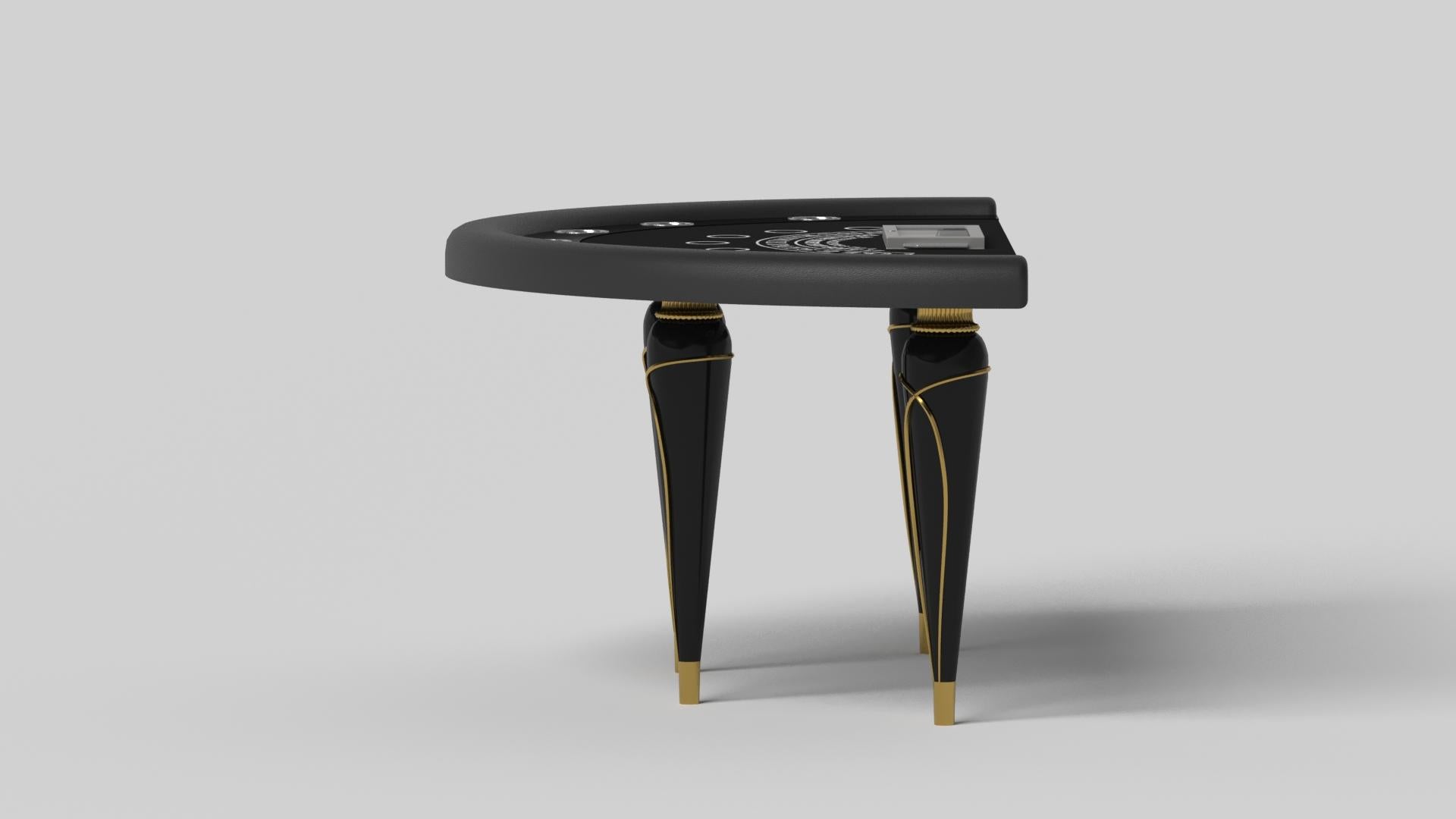 Champagne gold accents add undeniable elegance to this luxury blackjack table. Offering superior playability and uncompromised style, this design features hand carved details, decorative metal elements, and metal sabots at the bottom of each leg. The side skirts are artfully trimmed to create the high and low texture of crown molding, providing a beautiful contrast against the smooth, tapered legs. With its distinctive combination of form and function, this blackjack table is a noteworthy addition to any room.