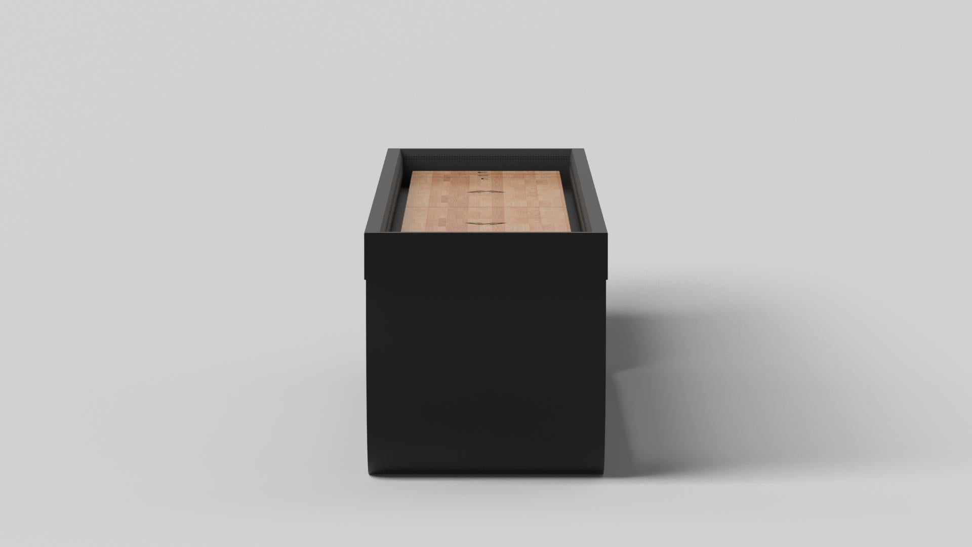 Handcrafted with intricate accents and a precision-carved curved base, the Sid shuffleboard table in black encompasses a series of smooth edges, distinctive details, and unconventional elements in one unique expression of luxury design. Built by hand from solid maple wood, this contemporary game table boasts a signature blend of expert craftsmanship and novel composition.