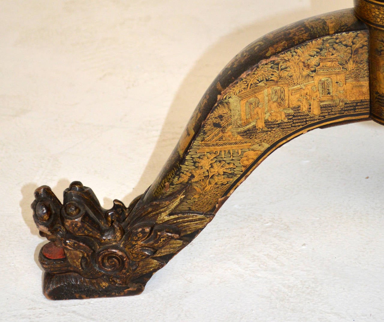 An exceptional 19th century English tripod table with a mosaic marble and slate intarsia top on a turned and carved baluster support terminating in a dragon-motif carved tripod base; of black and red lacquer grounds with gilt decoration of figural scenes of floral motifs, early 19th century.