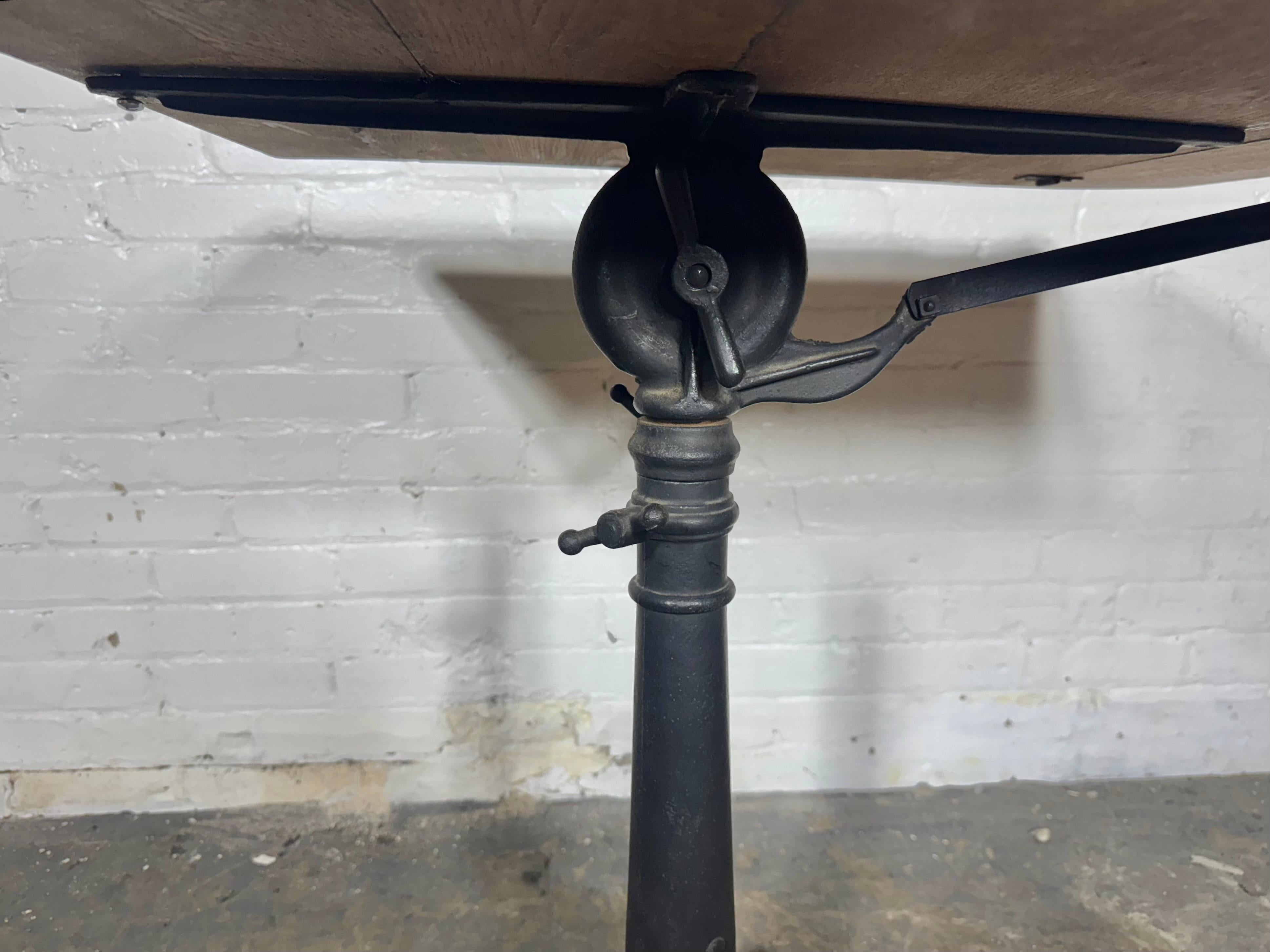 This is the quintessential architects drawing table. An articulating cast iron base and a beautiful quarter sawn oak plank drawing board. The table turns, moves up and down and tilts...