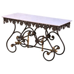 A vintage French baker's or pastry table, featuring a chamfered white Carrera marble top resting on wood and a wrought iron base with decorative scrolling and brass accents. They we...