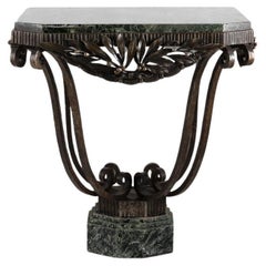 French table combines Brutalist metalwork with artisan tile craftsmanship from the Mid-Century period. The frame employs traditional barley-twist ironwork, where each leg is hand-for...