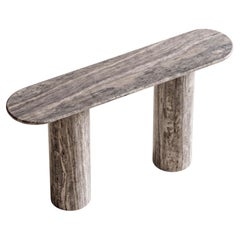 ‘Aurea’ Side Table by HAAND, crafted from premium silver travertine. This exquisite piece measures 13.8 inches in diameter and 18.5 inches in height, with a substantial weight of 80 lbs.