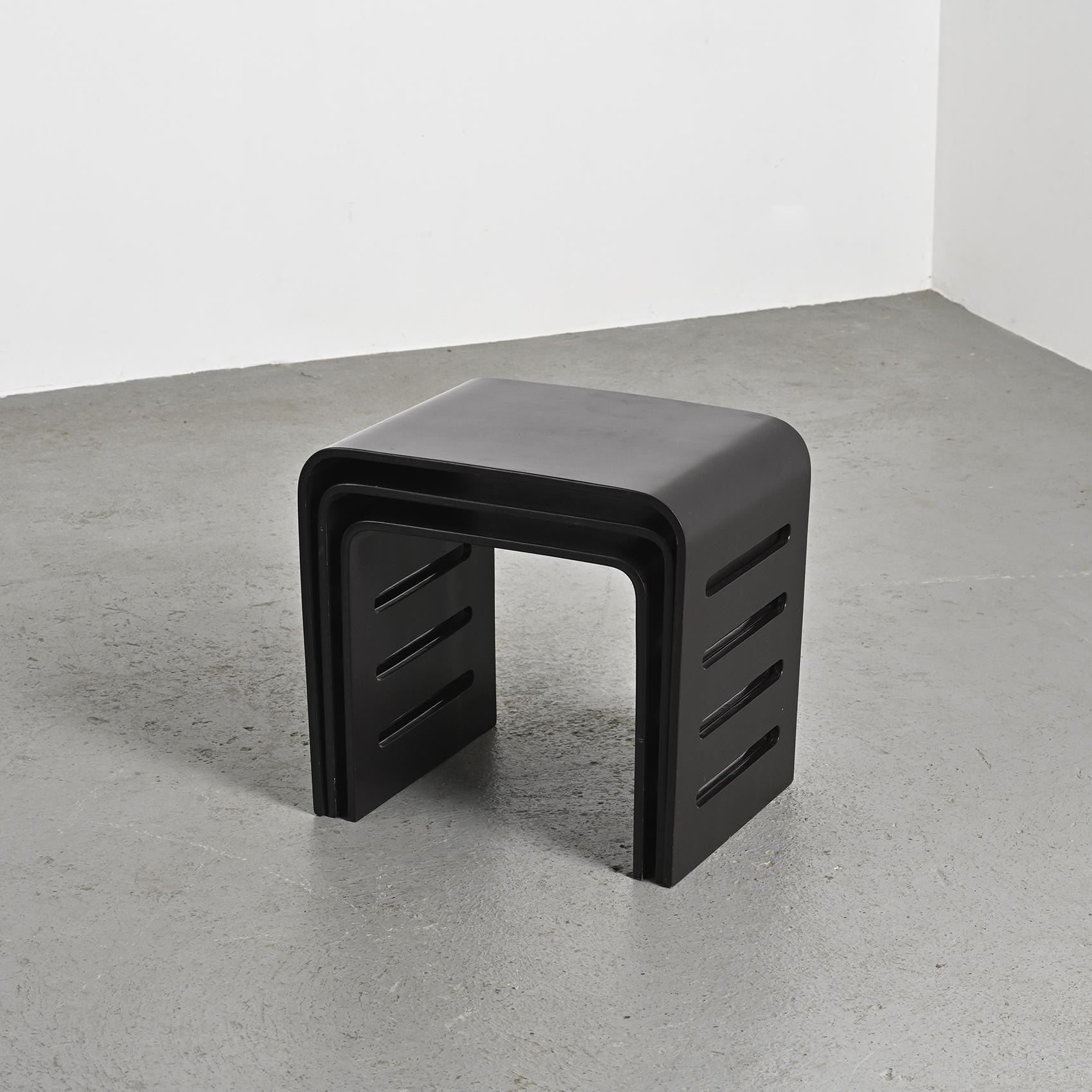 Set of 3 black-lacquered wooden nesting tables, designed by Ricardo Blanco, an Argentine designer active in the 1970s.