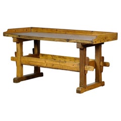 The appeal of this old work table comes from the aged wood itself, worn and distressed through years of use adding to the character imbedded in the table. Notice the expected age-related separation of the planks of wood that comprise the top, in addition to cracks, stains and heavy gouges. The industrial iron base is solid, allowing this to function as a desk, console, work or craft table. This rustic work table has been restored so is strong, stable and ready for use.