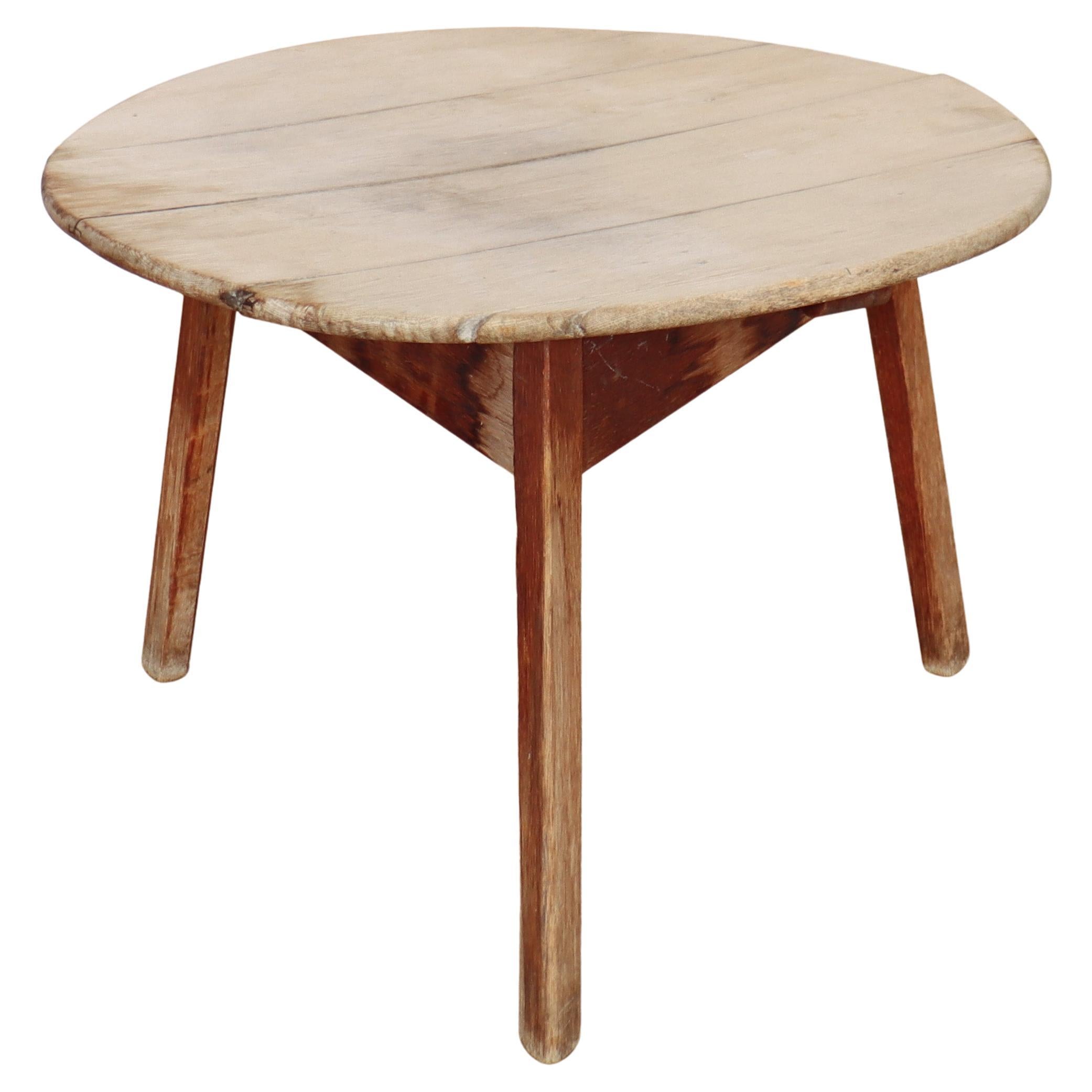 A classic example of English country furniture, this 19th-century cricket table is crafted from warmly patinated pine with a quiet, utilitarian elegance. The circular top rests on three slightly splayed legs joined by a triangular stretcher, a hallmark of traditional cricket table construction designed for stability and symmetry. At just under 30 inches in height, its proportions make it ideal for use as a lamp table, side table, or even a casual accent piece in a kitchen or hallway.