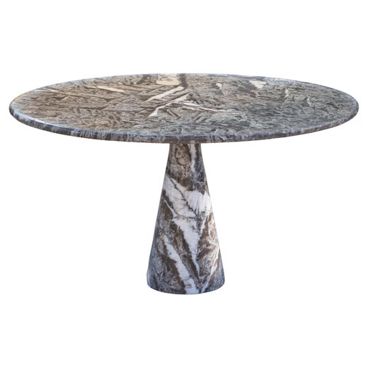 In 1971, Mangiarotti introduced what became his signature designs: a series of tables in marble and other stones that featured “gravity joints,” their legs held in place by the weight of the tabletop. Tables in his Eros collection have muscular proportions that anticipate the robust, overscaled lines of postmodern works that would appear 10 years later: His Eccentrico table, for example, is a striking assemblage in marble featuring a top that is cantilevered dramatically on a canted columnar base.