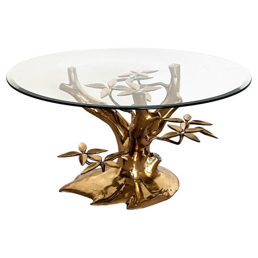 Daro’s lighting fixtures add visual intrigue to bedrooms and living rooms. Each lamp, pendant and chandelier has a distinct personality, such as through the contrast of a metallic finish with a large shell or a geode. Daro’s fixtures often see an integration of botanical and floral flourishes, complete with intricate brass leaves and petals. His tables similarly draw on the natural world — metal bases shaped like bonsai trees are topped with thick glass surfaces that allow for visibility of the sculptural forms below. Today, Daro's pieces remain highly collectible, fetching considerable prices at auction.