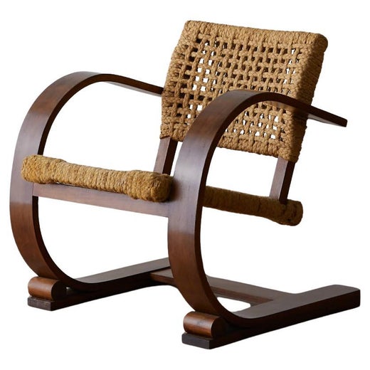 Minnet and Audoux spent much of their time in the Provence region, a hub of creativity where other artists such as Pablo Picasso found endless inspiration. They created everything from lighting to lounge chairs and end tables that reflected a nautical theme and coastal living. Minnet and Audoux’s imaginative works — table lamps with shades covered in raffia, oak benches with seat backs of woven rope — were made available to passers-by in the duo’s retail outlet in the seaside resort town of Golfe-Juan. The pair also incorporated woven rope into larger pieces such as armchairs and side tables. These furnishings are often compared to the work of similarly adventurous Union des Artistes Modernes member Charlotte Perriand. Several of Audoux and Minnet’s seating pieces are on display at the Maison Dumas in St. Tropez, France.