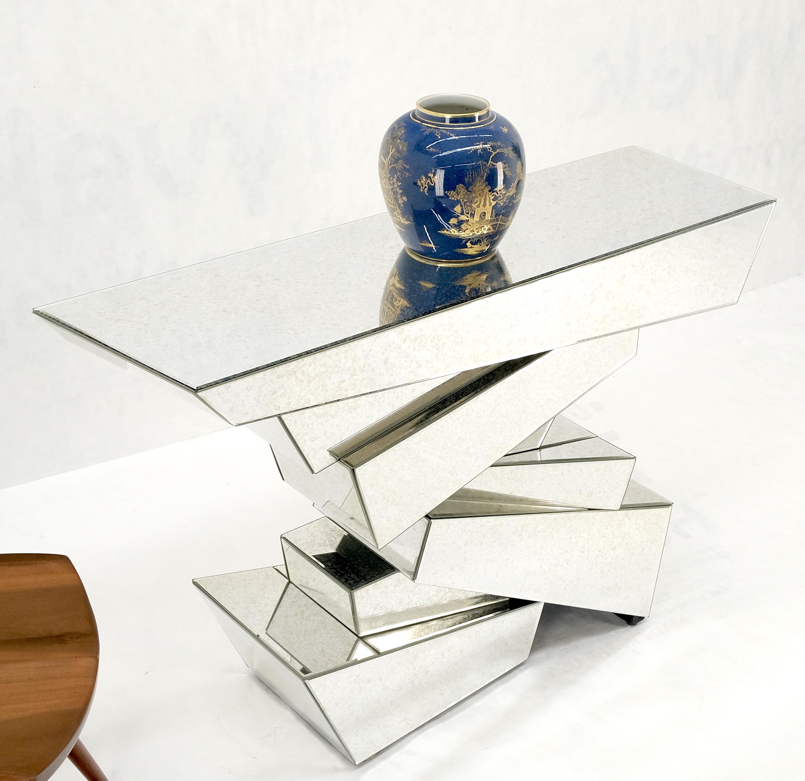 This unique vintage console table features two-tone beveled glass top and mirrored pedestal base. Perfect table for entryway, hall, or office display. Please confirm item location (N...