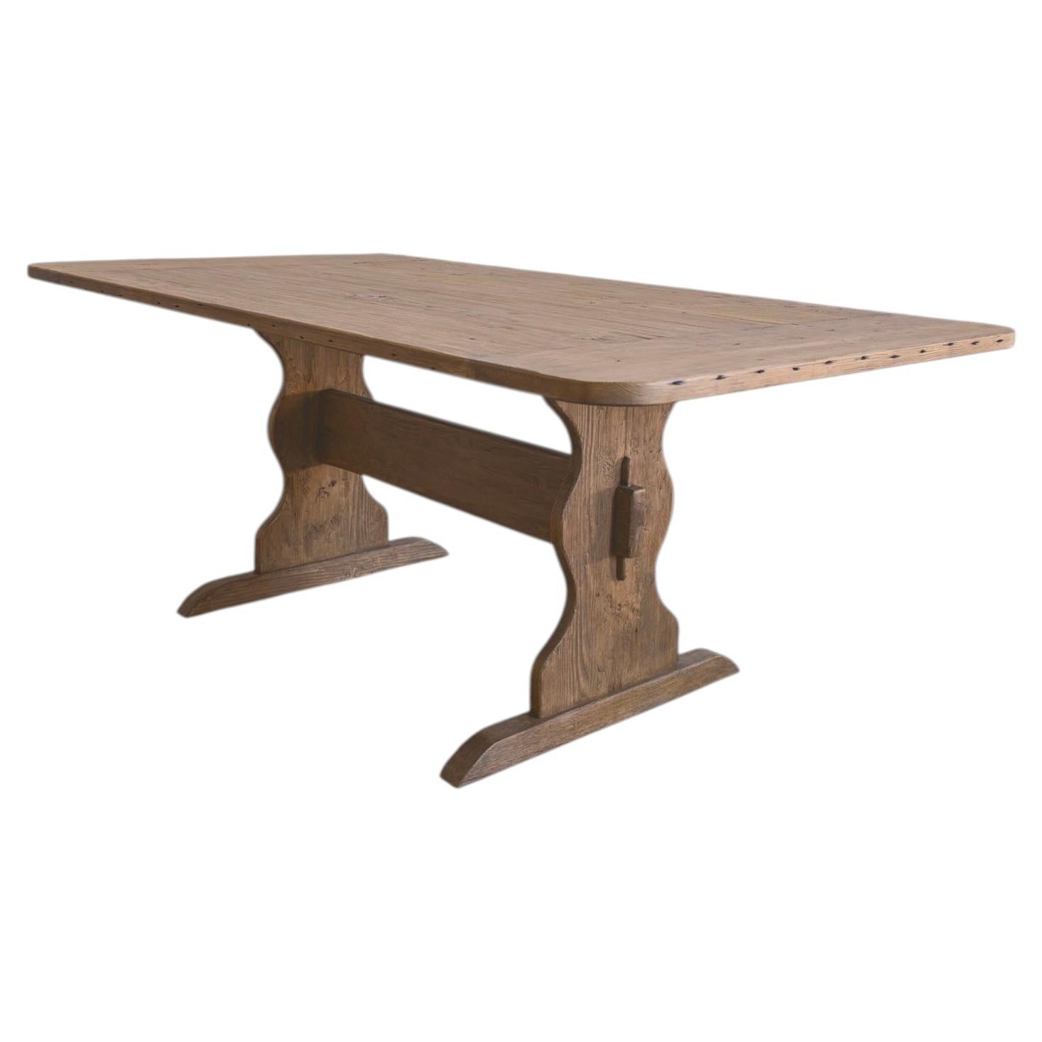 A substantial late 19th/early 20th Century rustic, country French farmhouse trestle dining table made in the decorative Arts and Crafts style. Constructed on a monumental scale from solid oak timbers featuring a thick plank top with a deep, rich natural patina. The top is supported by double square post legs conjoined by a long stretcher having an exposed mortise and tenon joinery. The multi-plank top, measuring 2" thick, presents a rustic surface with authentic tool marks and an aged patina. Shaped trestle feet and mortise-and-tenon joinery give the table a stable, classical presence and profile. The "H"-shaped uprights and pedestal shaped sled feet suggest refectory or monasterial origins. The table works across styles of French Provincial, Rustic, European Farmhouse, Wabi-Sabi, and Country Arts and Crafts...