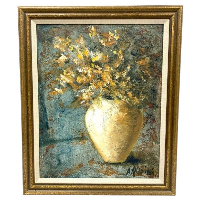 This is an original vintage oil on plate still life painting with the motive of a yellow and black vase with branches of green and reddish-brown leaves on a wooden table alongside a ...