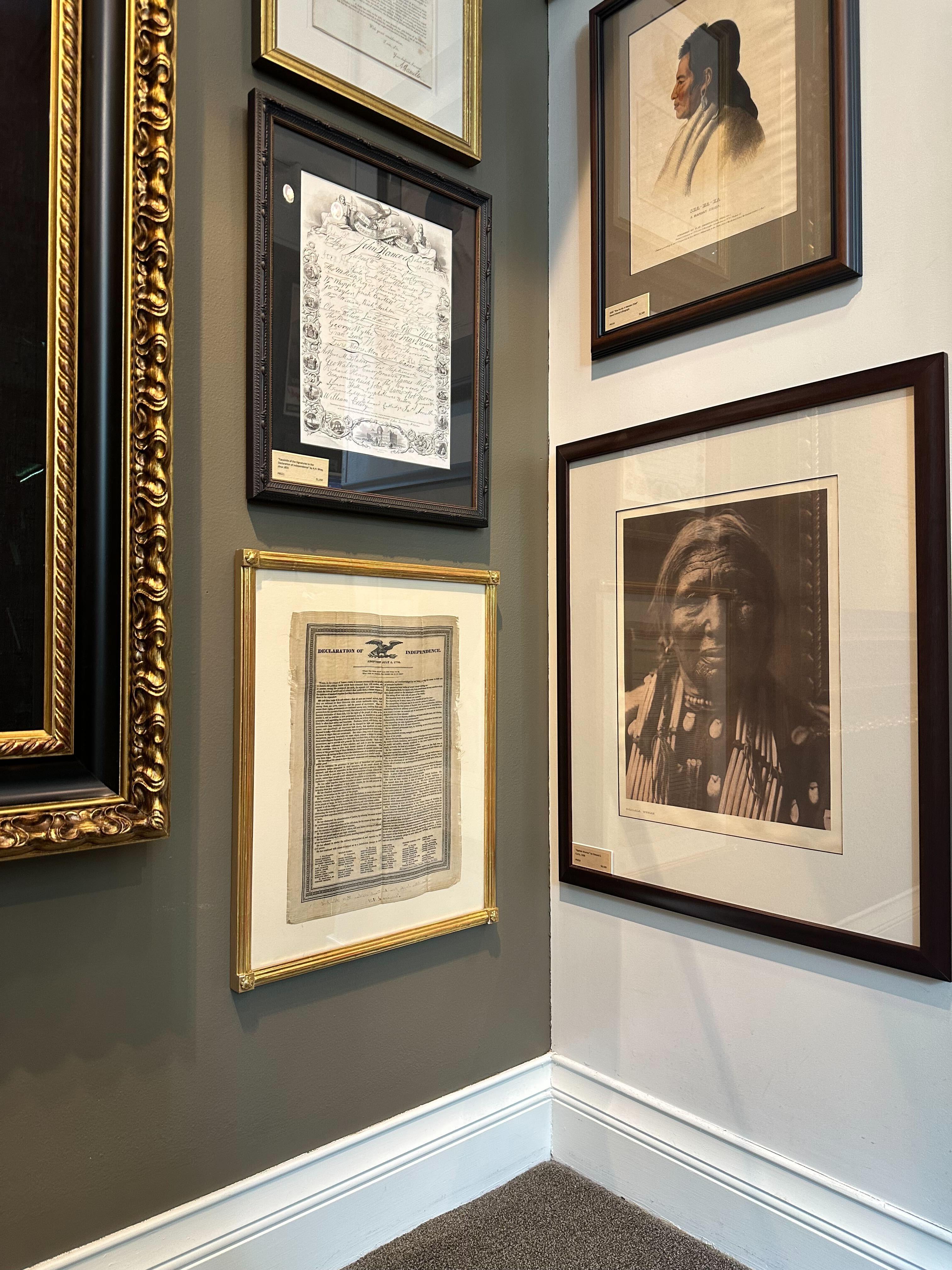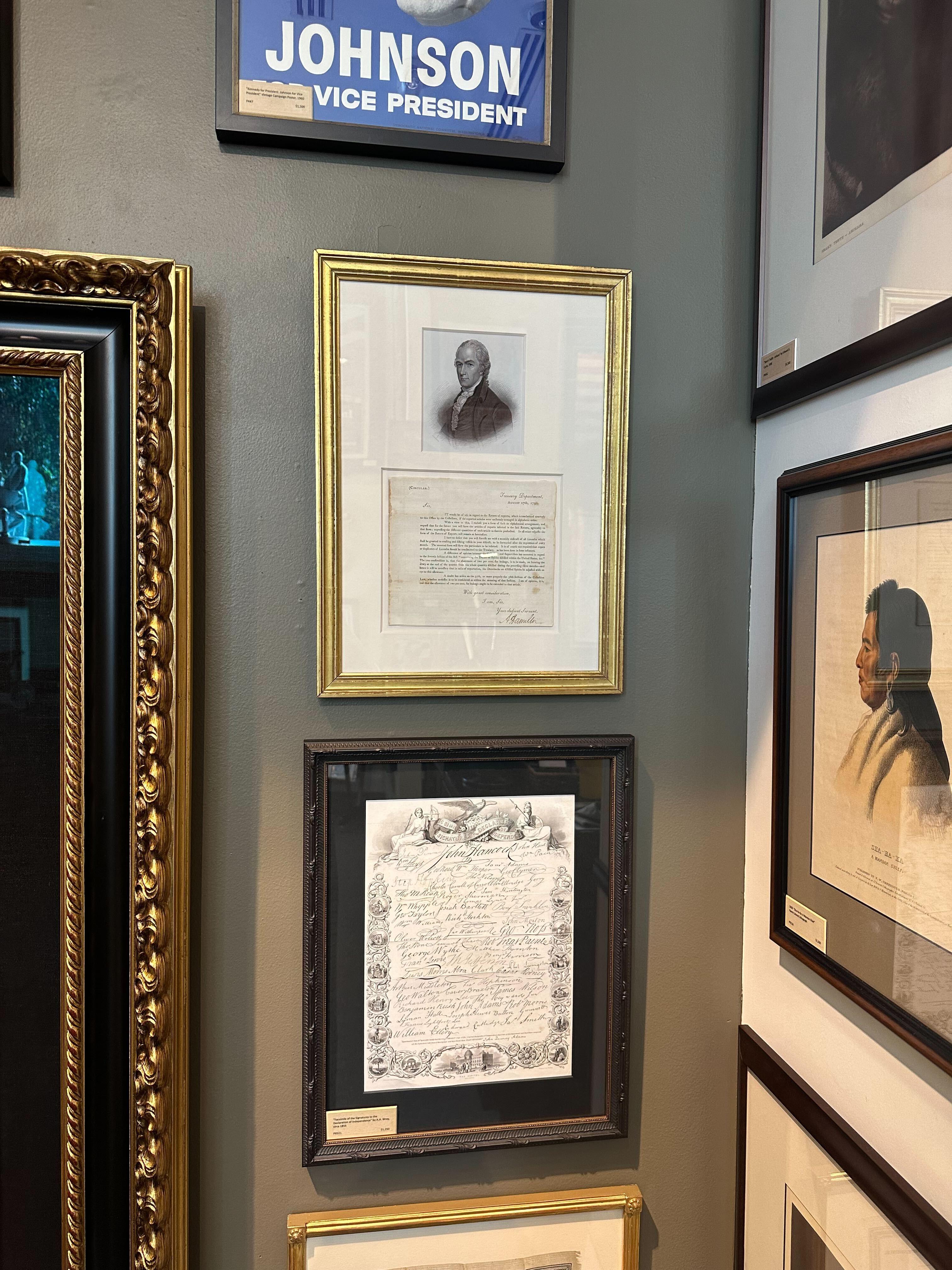 The signatures to this iconic document shine at the center of the document, engraved with artful accuracy. The print’s composition is then further accented by a decorative border. Seated at top are allegorical figures of Justice and Liberty. Justice is depicted as a woman carrying scales and a sword and Liberty dons a liberty cap and carries a spear and shield. A spreadwing eagle is situated between them, perched on a U.S. shield, with the engraving’s title presented in unfurling scrolls.