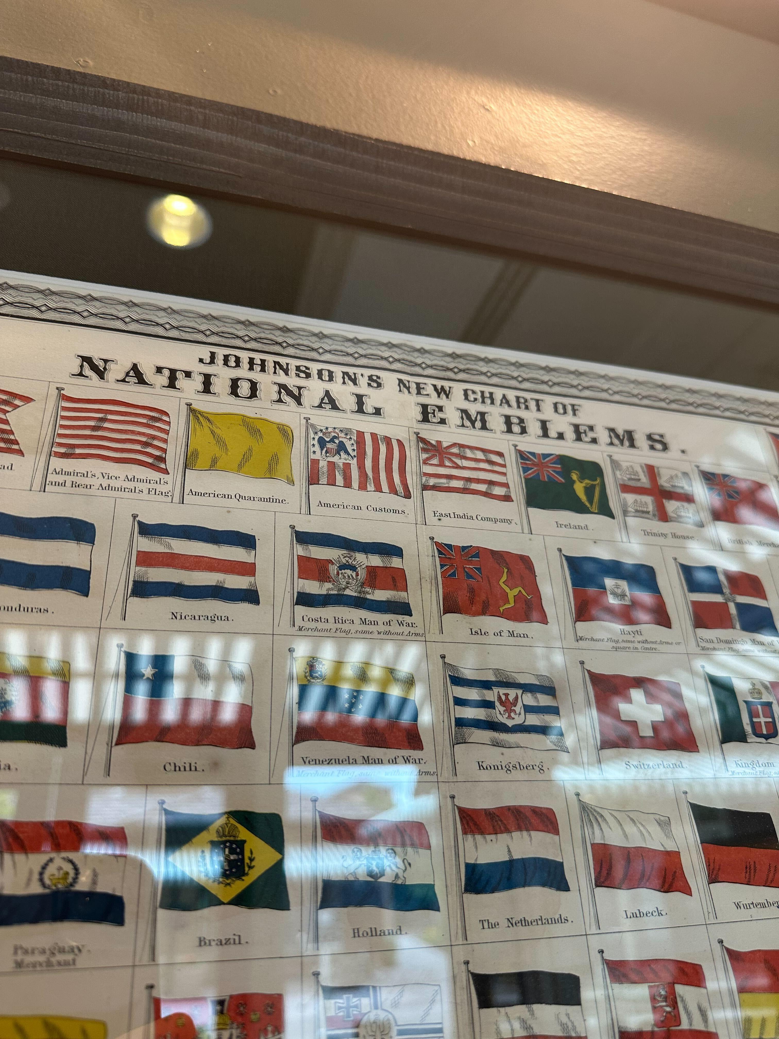 Presented is a hand-colored engraving of “Johnson's New Chart of National Emblems.” This print was created for “Johnson's New Illustrated Family Atlas of the World,” published by A.J. Johnson, in New York in 1870. The chart features 118 flags, standards, and signals associated with countries in Europe, Asia, Africa, South America, and the United States, as well as the ensigns of prominent merchant companies. The engraving is hand colored in red, white, black, blue, yellow, and green. Flag sheets and charts like this one were made primarily for the use of sea captains and ship chandlers to identify the nationality of ships in open waters.