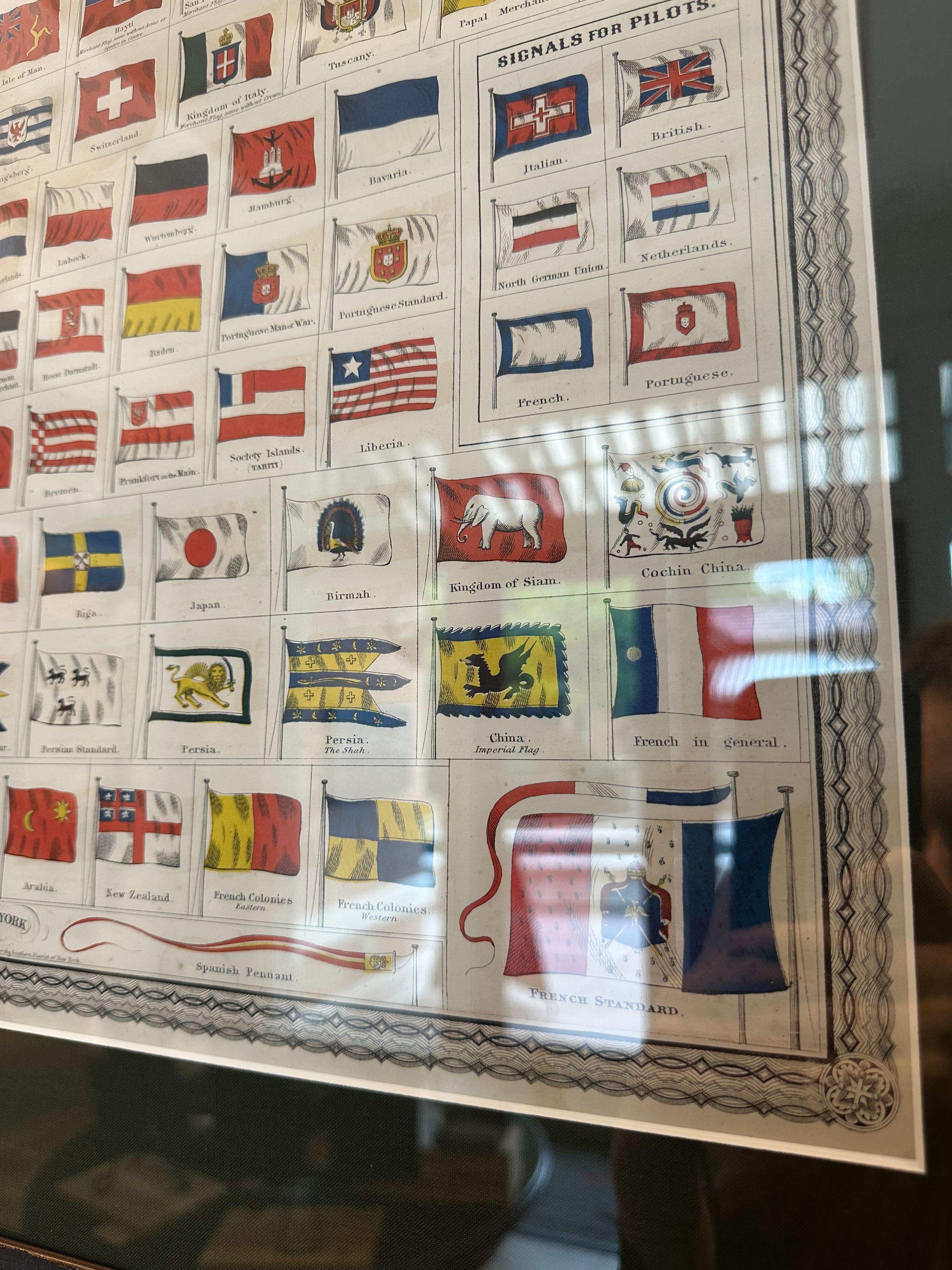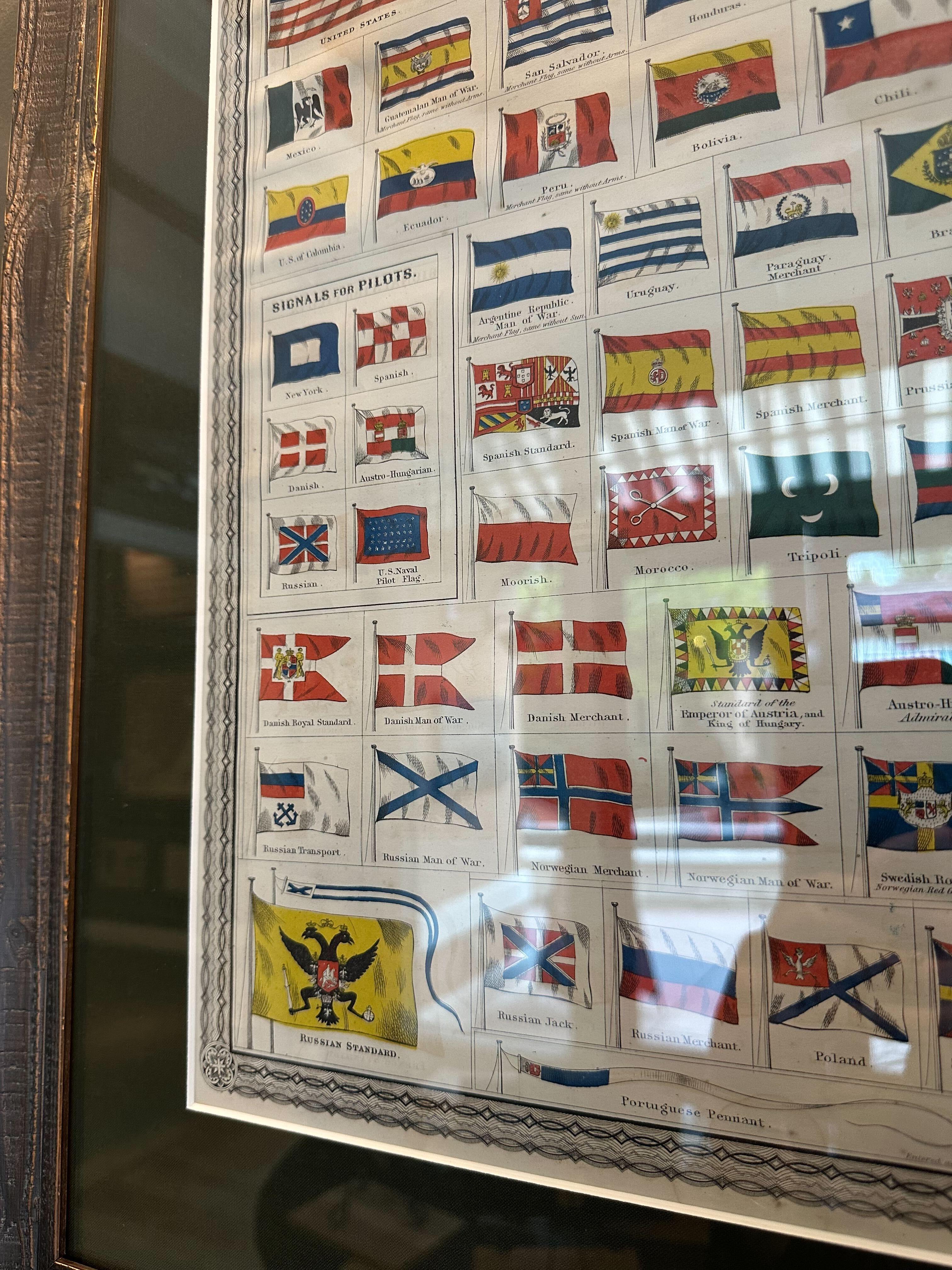 The flags on this chart offer an interesting snapshot of the powerful nations of the mid-19th century, just after the American Civil War. Many countries have multiple flags depicted, including national and nautical flags. At top left is the American flag, represented with 37-stars, reflective of the admission of Nebraska to the Union in 1867. At top right is the "Royal Standard of the United Kingdom, Great Britain & Ireland," with the "Russian Standard" and "French Standard" at the bottom. There are 12 "Signals for Pilots," 6 on each side, in an inset chart in the middle. A “Portuguese Pennant” and a “Spanish Pennant” are featured at the bottom of the engraving.