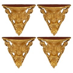 This Gothic console for wall mounting dates from the late 1800s and it has a marvelous combination of floral Gothic elements that make it a joy to own, to use and to look at. All handcrafted more than 100 years ago and always well taken care of, this Gothic Revival wall bracket has the most wonderful shape and a striking patina. This organic design with its natural, flowing lines of the deeply carved Gothic leaves also give it an almost circular look and feel.