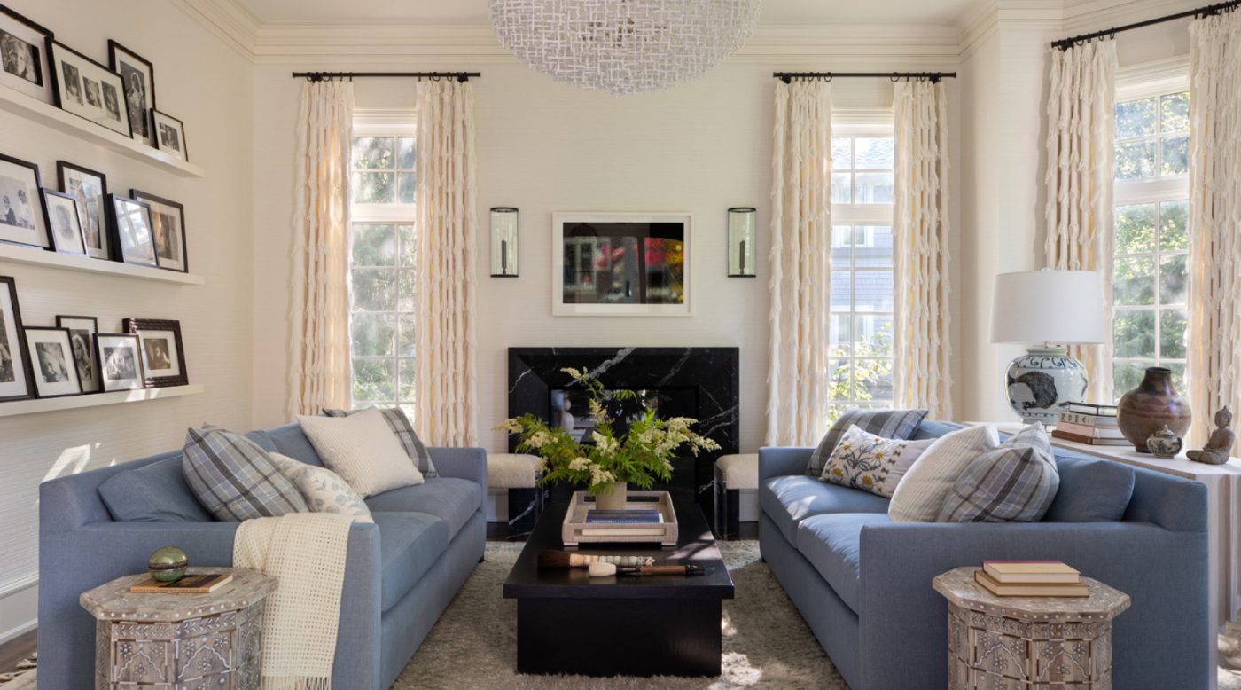 Goldman personalized the formal living room by fitting its back wall with narrow shelves to display a changing selection of photos of the couple’s children. Placed beneath a contemporary chandelier, a pair of trim but cushy custom sofas encourage intimate, relaxed conversations, while ivory-fringed draperies in a Schumacher textile and a fluffy pastel Berber rug enhance the genial ambience.