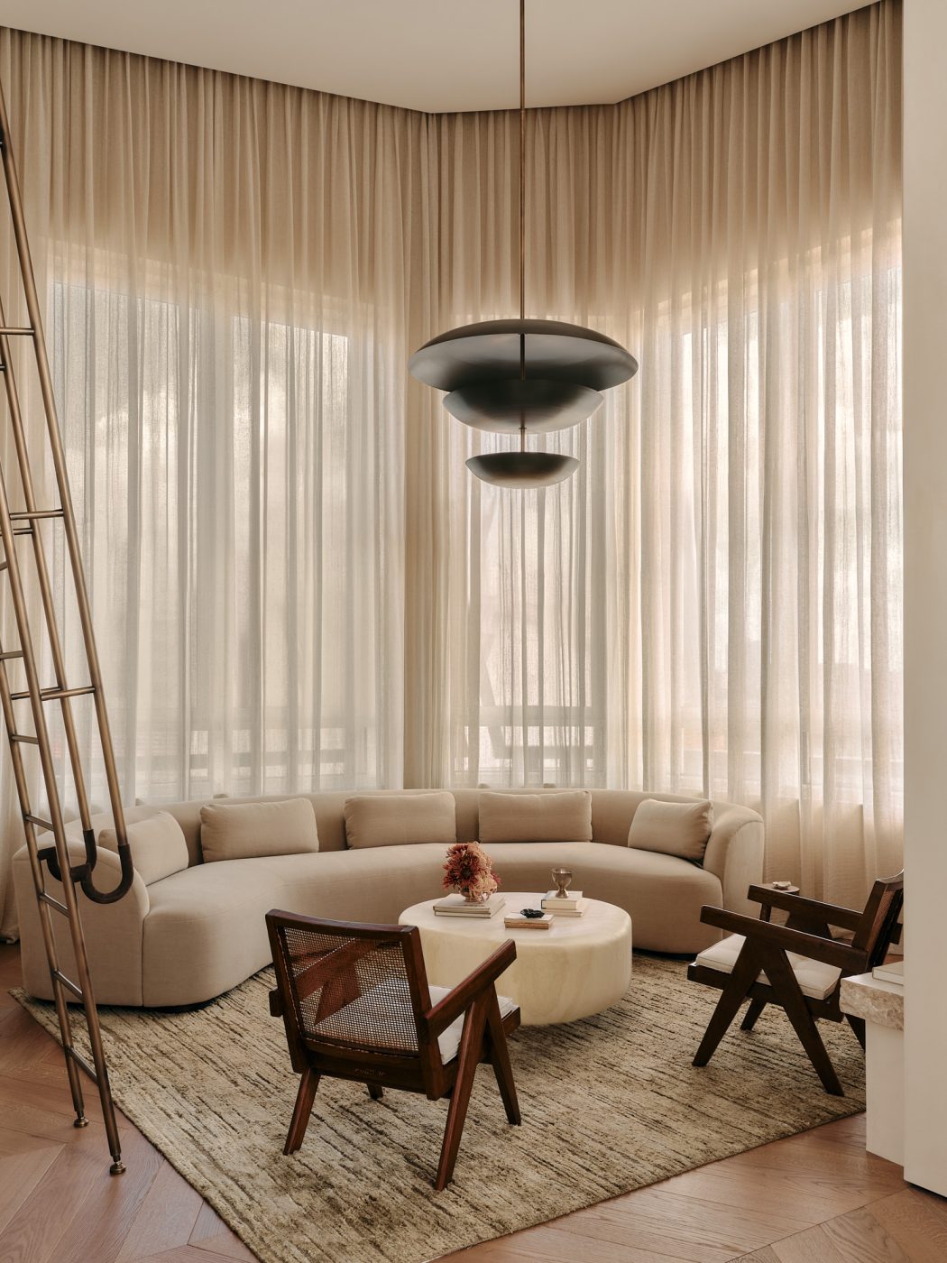 Double-height windows give the living room drama, as does a mid-century-inspired custom bookcase in dark oak and aged brass that climbs another wall. A bespoke flax-colored sofa curves in front of the windows, facing a pair of vintage Pierre Jeanneret Easy armchairs.