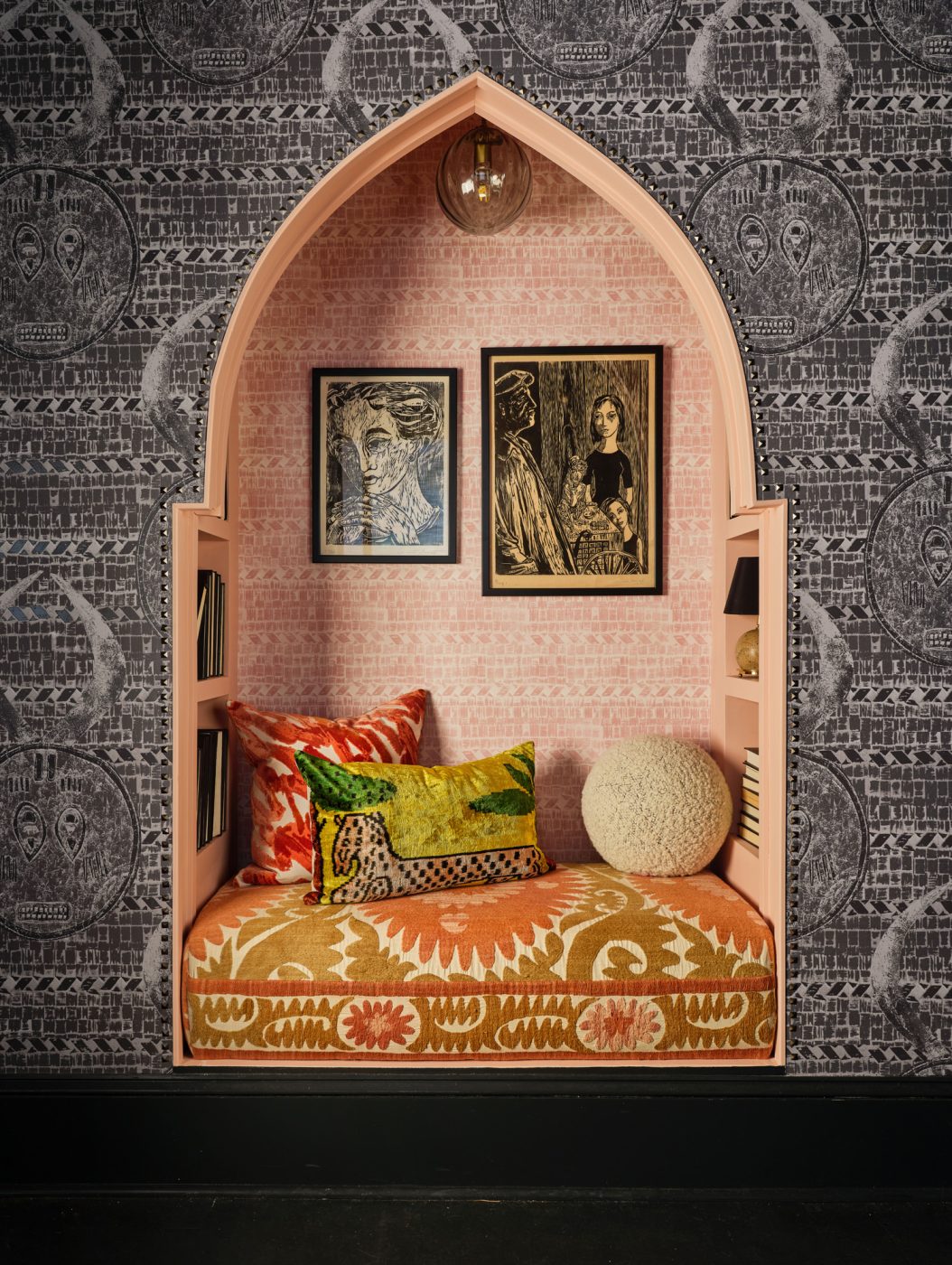 Drawing on her childhood in Nigeria and subsequent travels in Morocco, Schumacher created a cocktail-ready lounge she affectionately dubbed the Pink Rhino Club. Sitting just off the brownstone’s foyer, “it’s designed to feel like a secret hideaway,” she says. “Part bar, part salon — a place that instantly transports you, glamorous and a little untamed.”