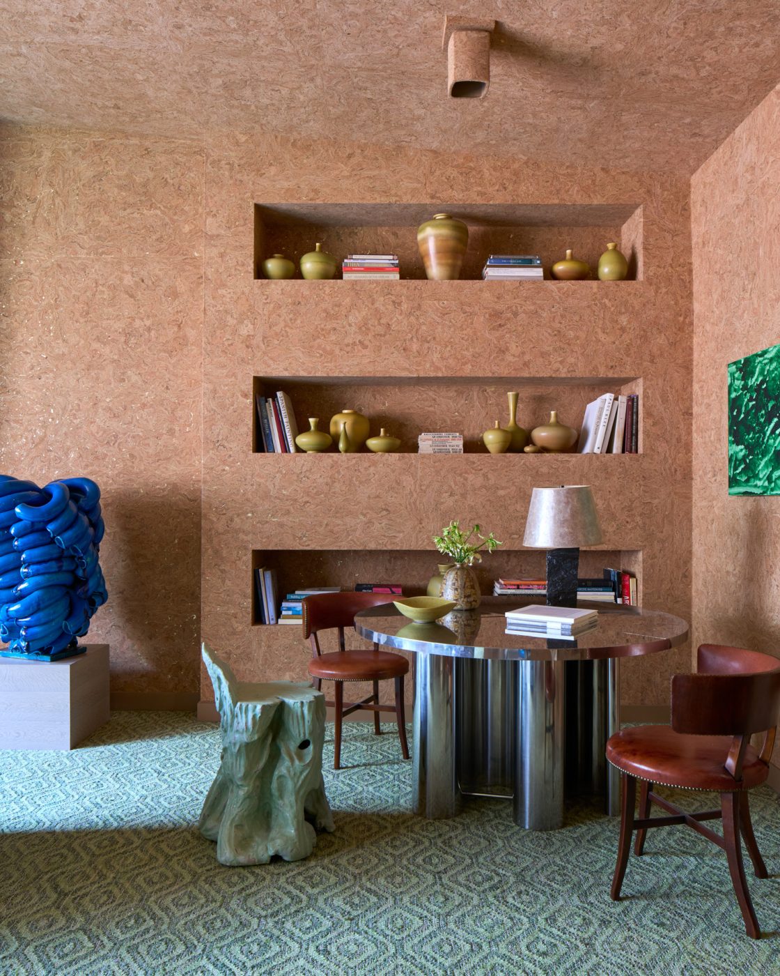 To incorporate both aesthetics, Huniford first wrapped the walls and ceiling in a gold-flecked cork from Phillip Jeffries, for a subtle tree-like vibe. He then selected a delicate sky-blue velvet to upholster the mammoth 23-foot built-in sofa he designed to run the length of one wall. In crafting the built-in side tables at the sofa’s ends, he says, “I was inspired by Mexican modernist designers like Clara Porset and Luis Barragán, who often integrated furniture directly into their architecture.”