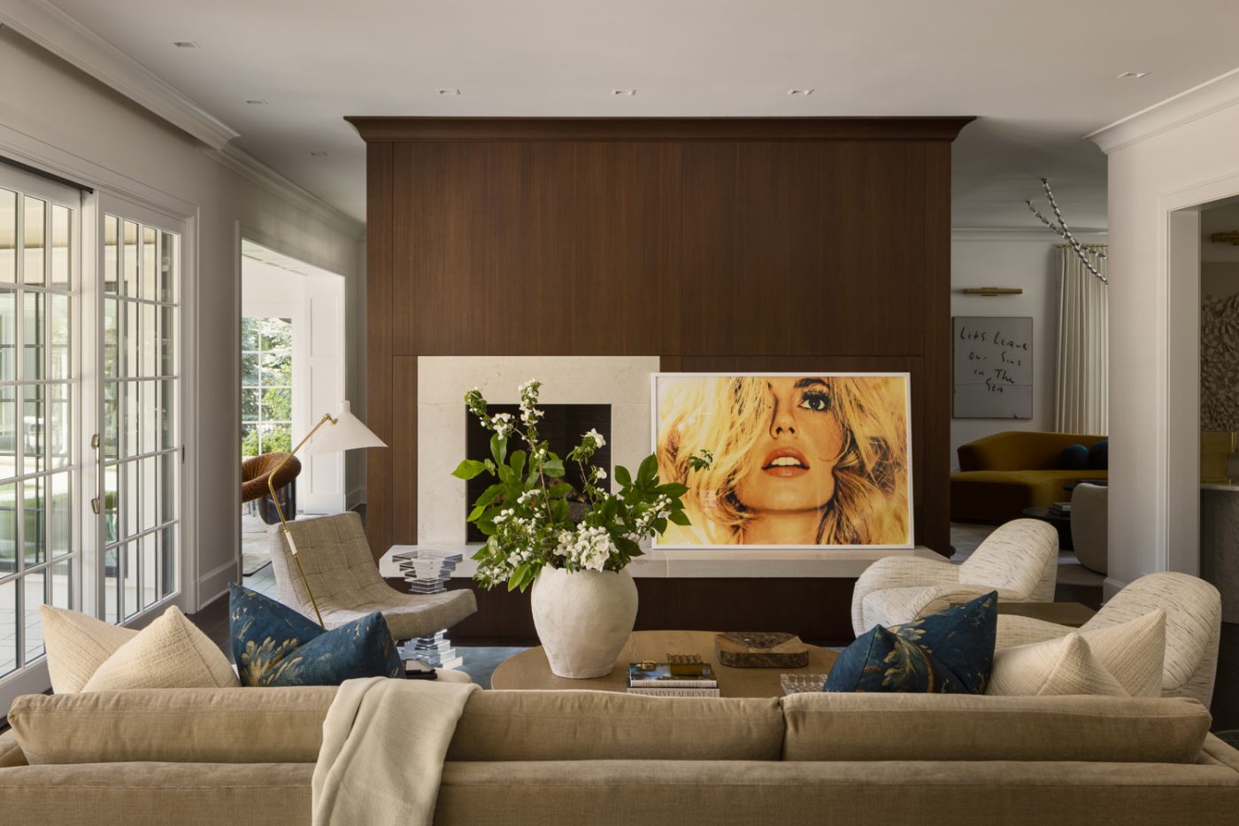 In the family room, Lee Industries swivel chairs sit with a custom sectional A photograph by Stephanie Vovas sits next to the fireplace.