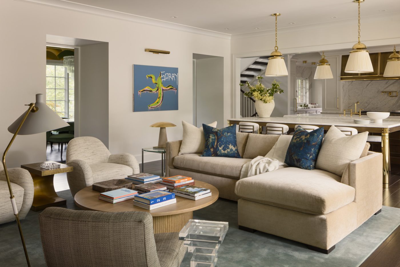 The designers took down a wall to open the family room to the kitchen, which is illuminated with Urban Electric Co. pendant lights. Hanging on the wall in the background is Denis Ouch’s Warhol’s Eaten Banana.