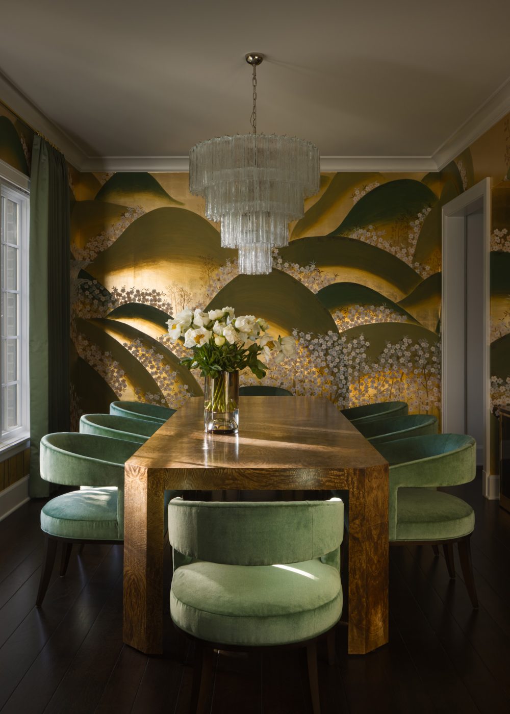 More gold gleams in the hardware of a glossy black 1970s Mastercraft sideboard and in table lamps with cone-shaped shades. The greens in the wallpaper are echoed in the jade-hued chair fabric. By a stroke of design kismet, the designer found on 1stDibs a Murano-glass chandelier with the faintest pistachio tint to complete the harmonious palette. “It saved the day,” Robins says.