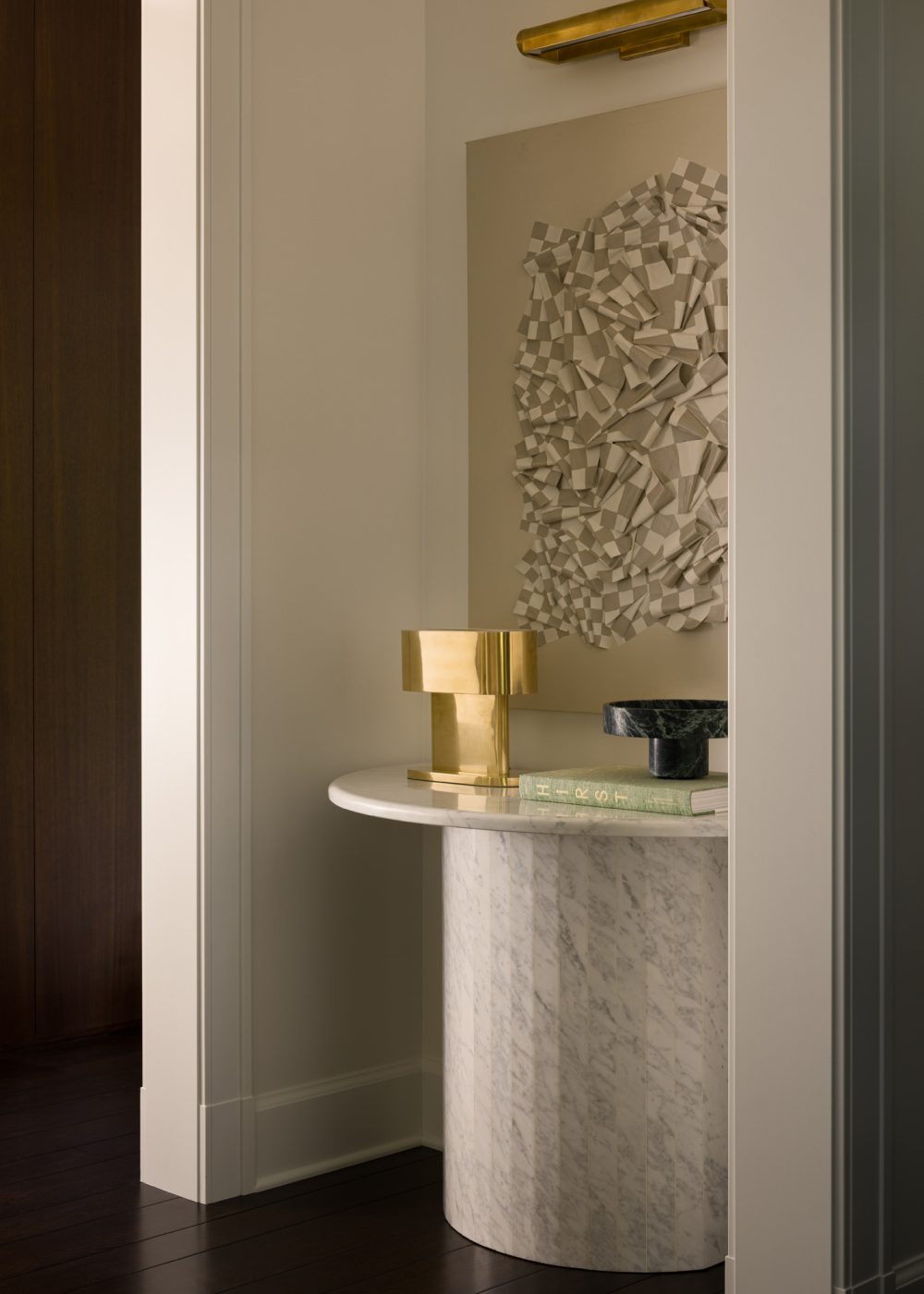 In the entry, the designers placed a 1970s marble table in a small alcove, illuminating the area with Visual Comfort lighting.
