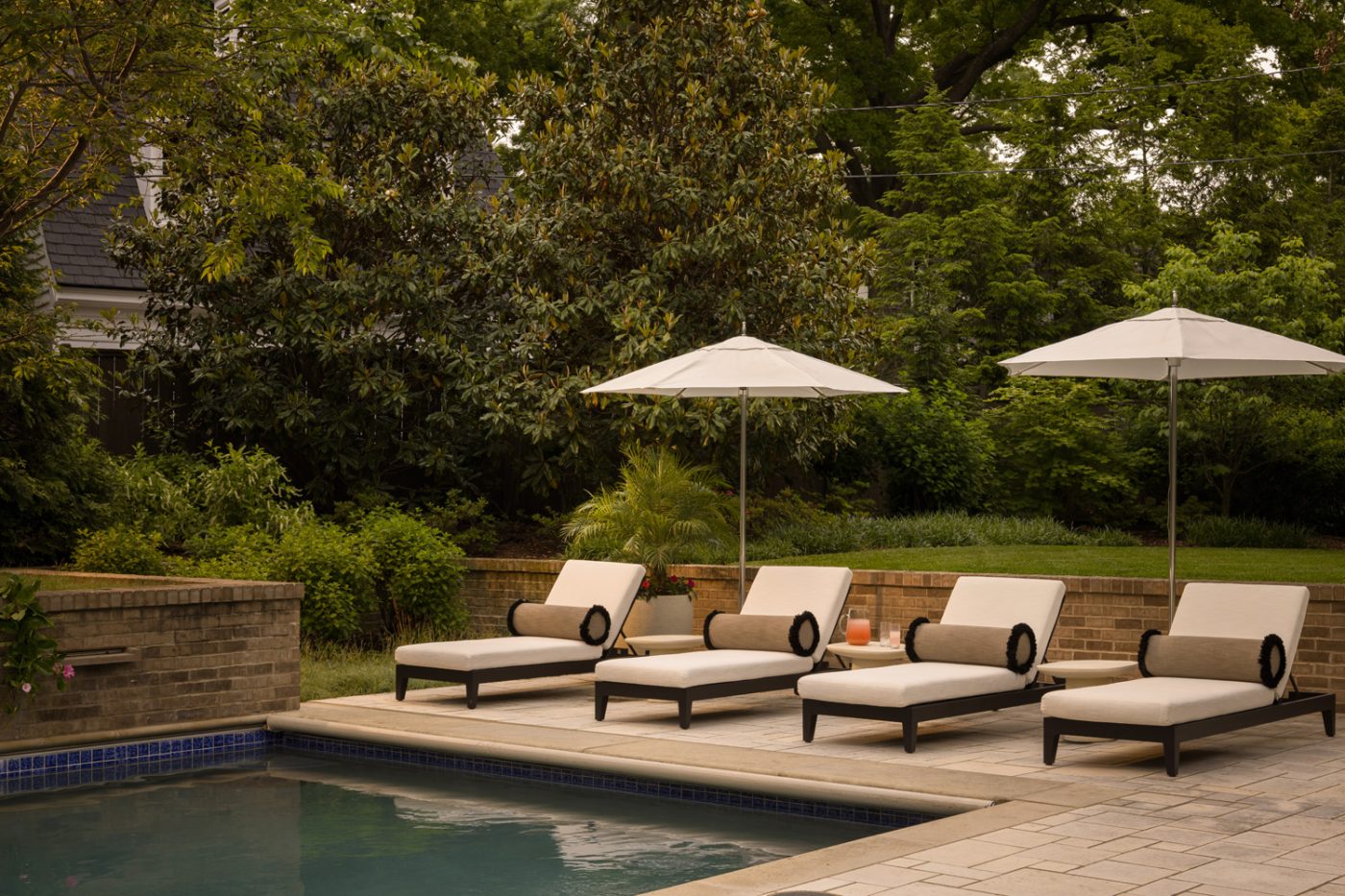 For the pool-side area, the designers selected contemporary outdoor chaises and umbrellas and designed custom pillows.