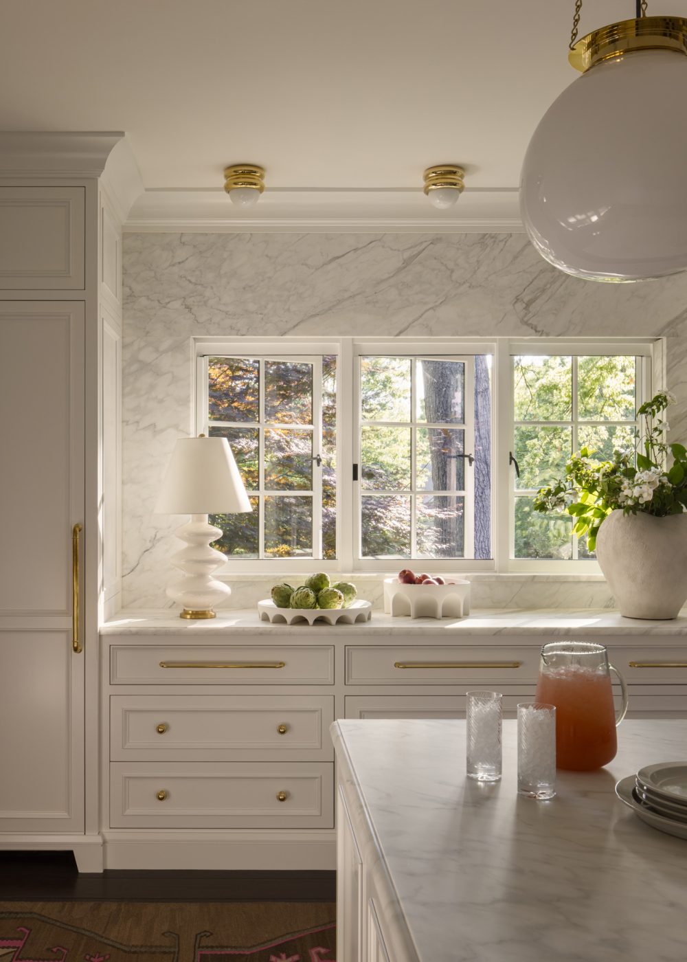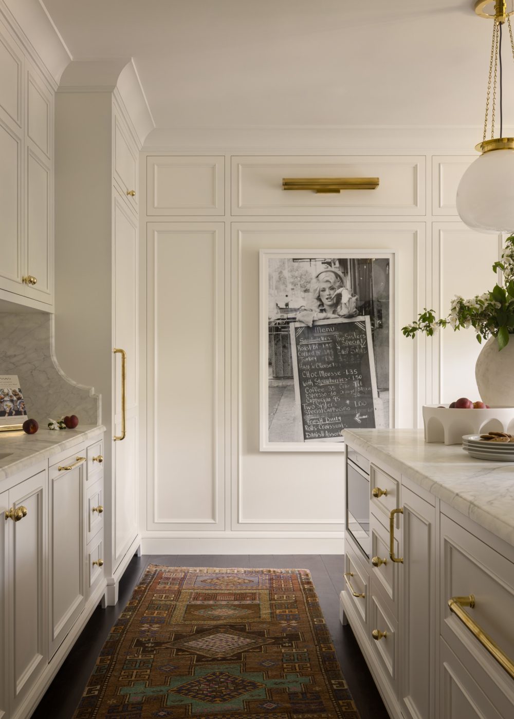 Tucked into the more casual back kitchen, just beyond, is a special moment the designers provided for the client: an enlargement of a vintage black-and-white David Gahr photo of Dolly Parton, one of her favorite personalities, who hails from the neighboring state of Tennessee.