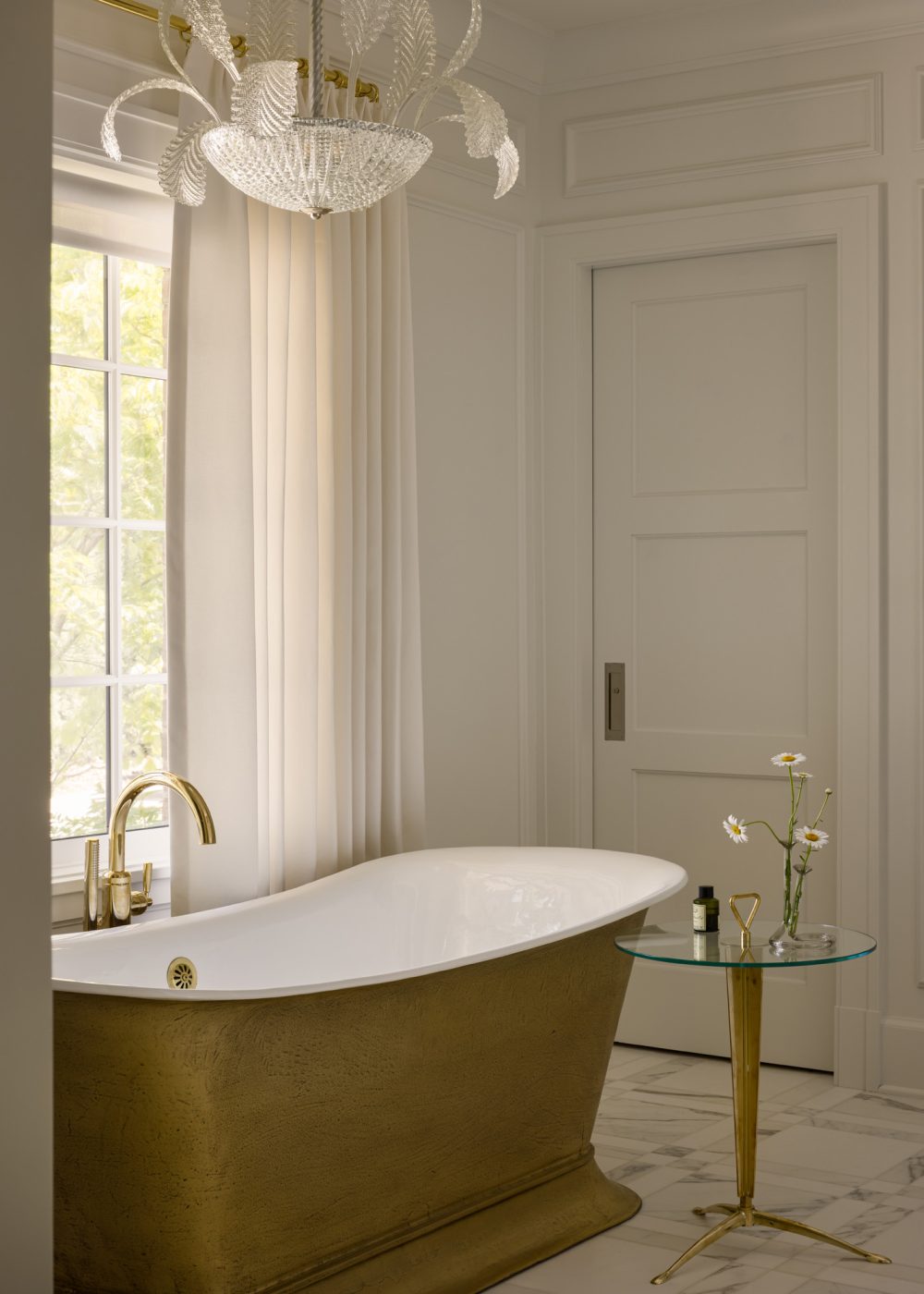 For the primary bath, the designers found a 1940s Murano-Glass chandelier with a leaf motif through Carlos De La Puente Antiques.