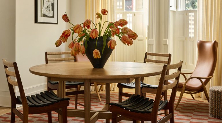 The designers sought to capture the essence of both these perspectives while helping the couple establish the look and feel they wanted for their home. Tapping into the wife’s passions and personality, Dendiberia and Rajai spun out a scheme that deployed fluid curves, as in the dining room’s wave-like ceramic rondo by Puerto Rican artist Jeannine Marchand and the breakfast’s room’s Vava Objects table, made from the sort of fiberglass used for the hulls of the husband’s beloved boats.
