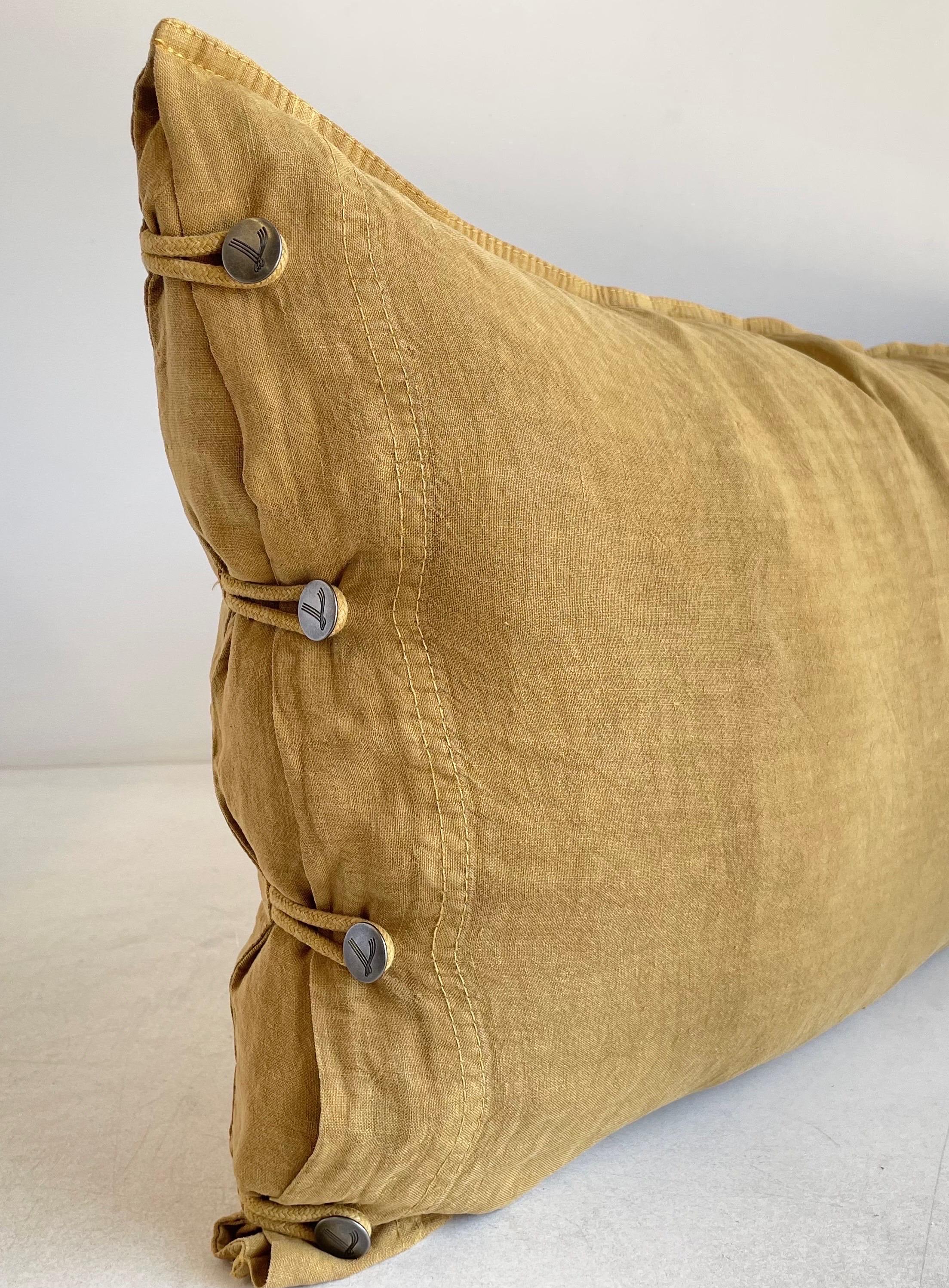 Questo cuscino in lino vintage di alta qualità, dal design artigianale australiano, offre un lusso informale fuso con l'eleganza contemporanea.