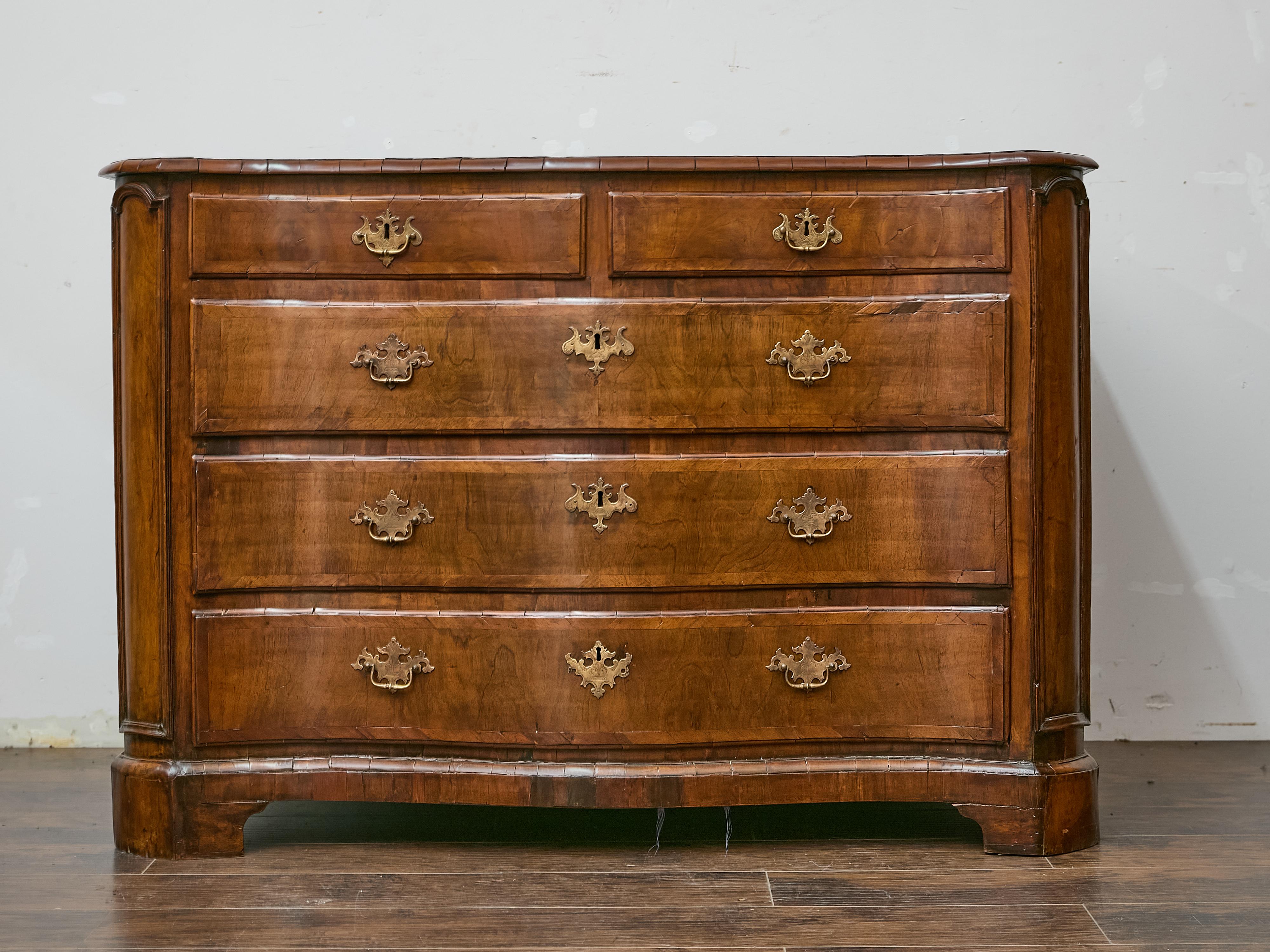 Commodo a tre cassetti a serpentina in noce del 1800 con ferramenta in bronzo