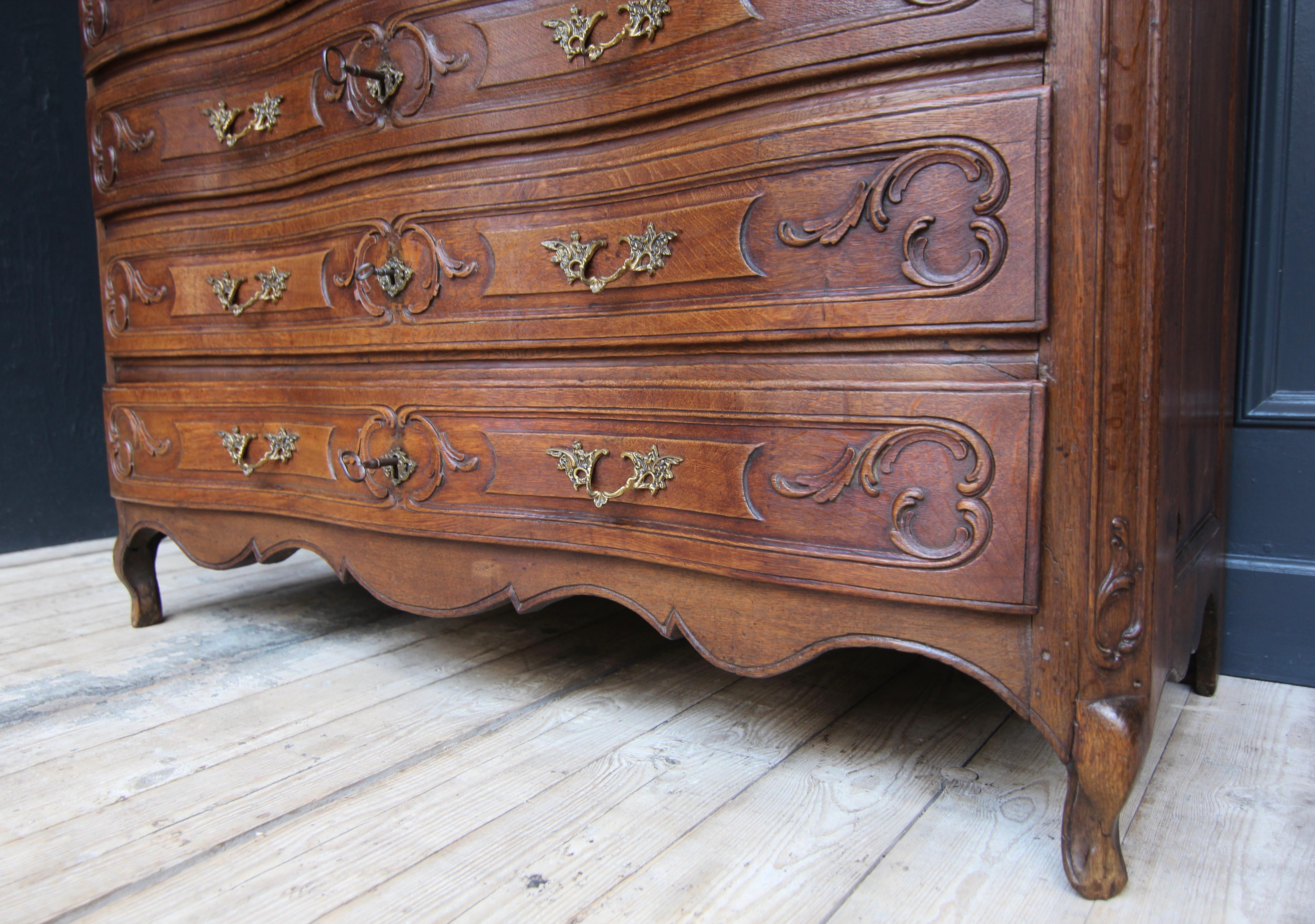 Un'elegante cassettiera barocca in rovere massiccio, realizzata nel XVIII secolo. Il pezzo è caratterizzato da una bella facciata curvilinea con quattro cassetti e una base staccabil...