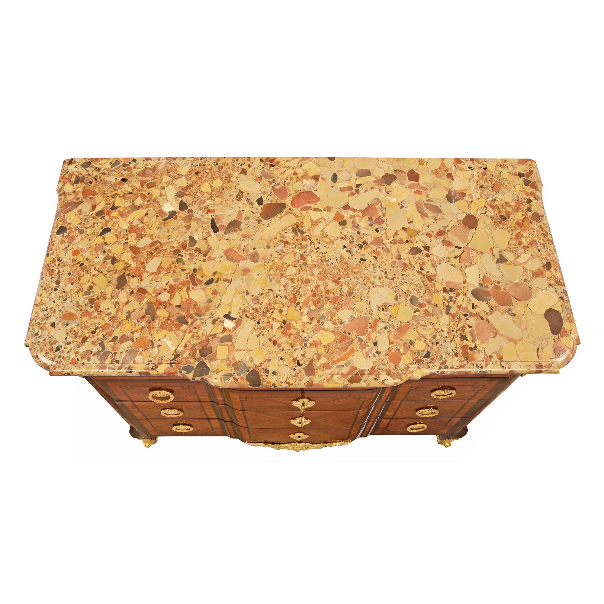 Commodo francese di transizione XV/XVI del XVIII secolo in legno di tulipano/legno di cervo con piano in marmo e supporti in ormù