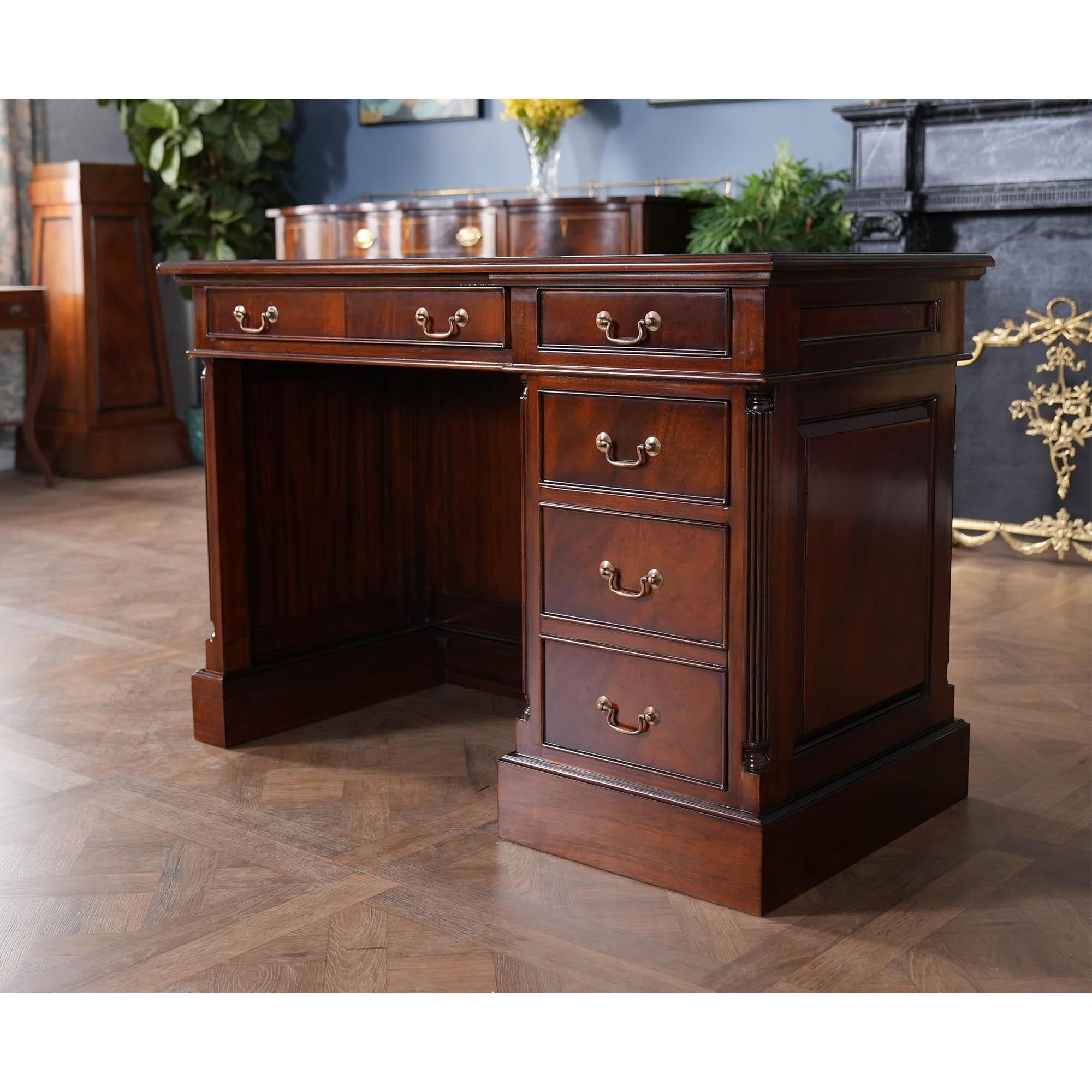 Una scrivania a banco singolo in mogano di alta qualità di Niagara Furniture con pannelli laterali in rilievo e una ricca finitura marrone simile a quella degli oggetti d'antiquariato inglesi. La superficie di scrittura in vera pelle marrone pieno fiore presenta una lavorazione dorata in stile antico. I tiranti in ottone massiccio completano la scrivania a banco singolo in mogano, mentre i pannelli formano i lati della scrivania. Con un cassetto per cartelle e tre cassetti standard, questa scrivania è sia decorativa che funzionale. L'ottima qualità costruttiva di tutta la scrivania è caratterizzata da quarti di colonna intagliati a mano e con incastri a coda di rondine.