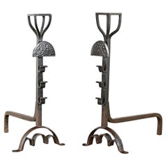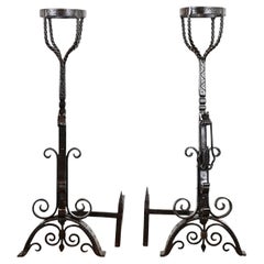 A sculptural pair of French 19th century cast iron fireplace andirons, or chenets, that hold as much fascination as the roaring fire behind them. Stylistically they fall between the ...