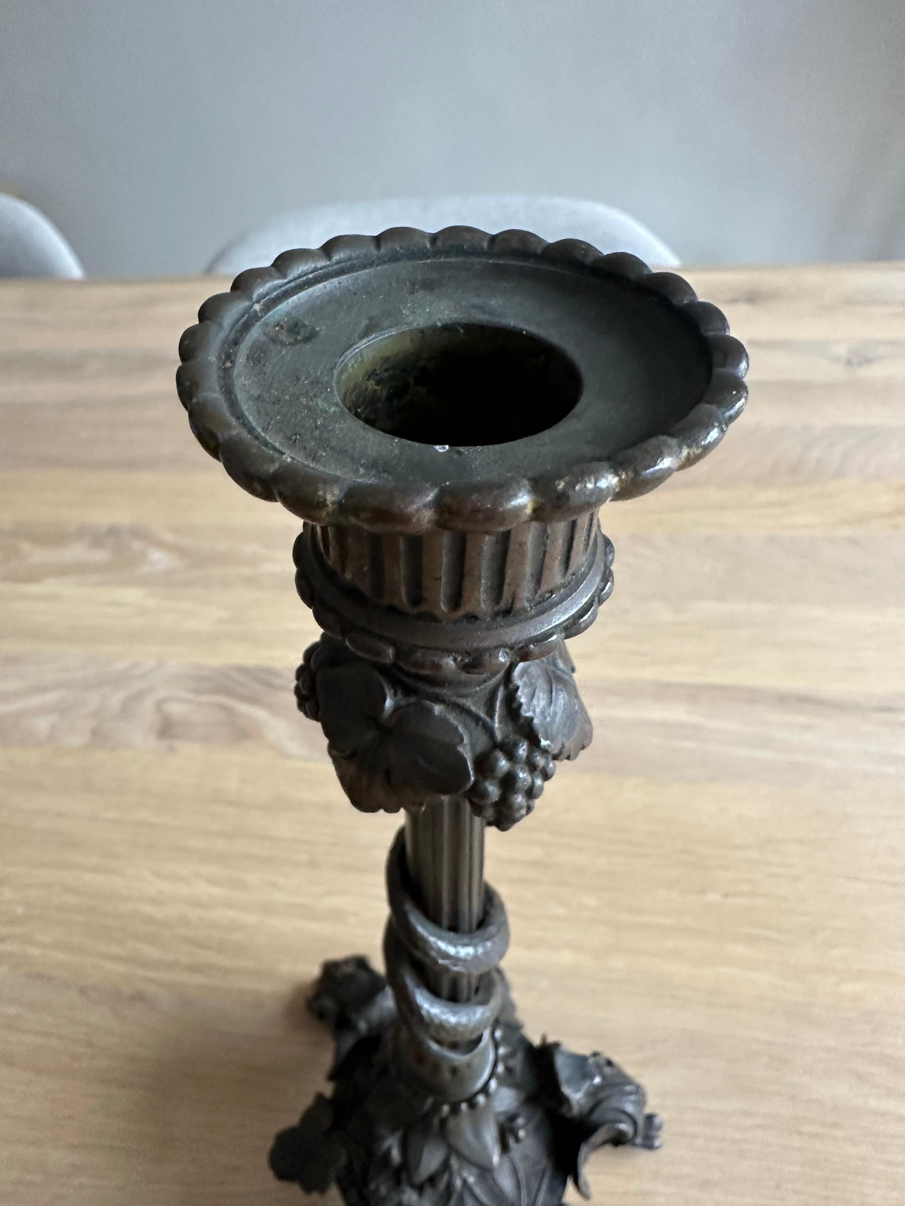Se sei alla ricerca di oggetti d'antiquariato in ottime condizioni per creare l'atmosfera perfetta, allora questa coppia di candelieri in bronzo, attraente e decorativa, potrebbe presto fare al caso tuo. Acquistiamo regolarmente da sgomberi di case benestanti e questa coppia l'abbiamo acquistata da una casa del XIX secolo nella città di Amsterdam. Il lavoro svolto per creare questi splendidi pezzi d'antiquariato di qualità e rarità ci ha fatto venire voglia di acquistarli immediatamente. Anche queste sculture Phoenix a treppiede e a piede d'artiglio in bronzo hanno un'incredibile patina e sono finemente dettagliate con serpenti che strisciano sugli steli e foglie con grappoli d'uva. Anche questi pezzi d'antiquariato hanno un ottimo rapporto qualità-prezzo e sono in ottime condizioni e presentano una patina meravigliosa. Inoltre, perché l'imballaggio perfetto e la consegna in tutto il mondo dal nostro negozio alla vostra porta in soli 4-6 giorni sono gratuiti.