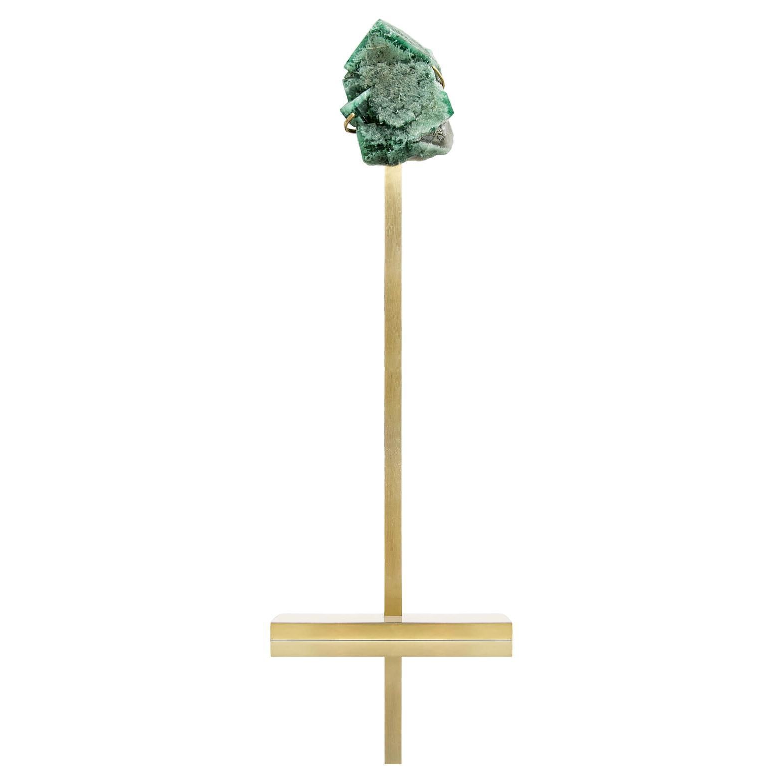 Una serie di cristalli di Malachite di qualità superiore preparati in casa e presentati su una serie di supporti in ottone, creati per ambienti di lusso all'interno della tua casa. La malachite a banda verde cristallizza nel sistema cristallino monoclino e nella maggior parte dei casi forma masse botrioidali, fibrose o stalagmitiche, che si trovano all'interno di fratture e cavità sotterranee profonde dove la falda acquifera e i fluidi idrotermali forniscono i mezzi per la precipitazione chimica.