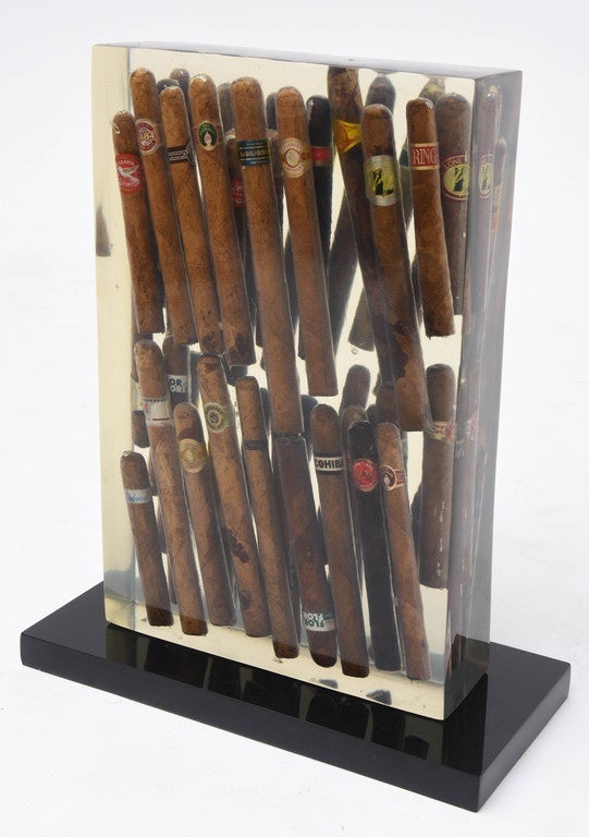 Una scultura unica dell'artista francese Arman. Questa collezione di sigari di classe mondiale racchiusi in resina trasparente è una quintessenza del periodo "Accumulations" di Arman...