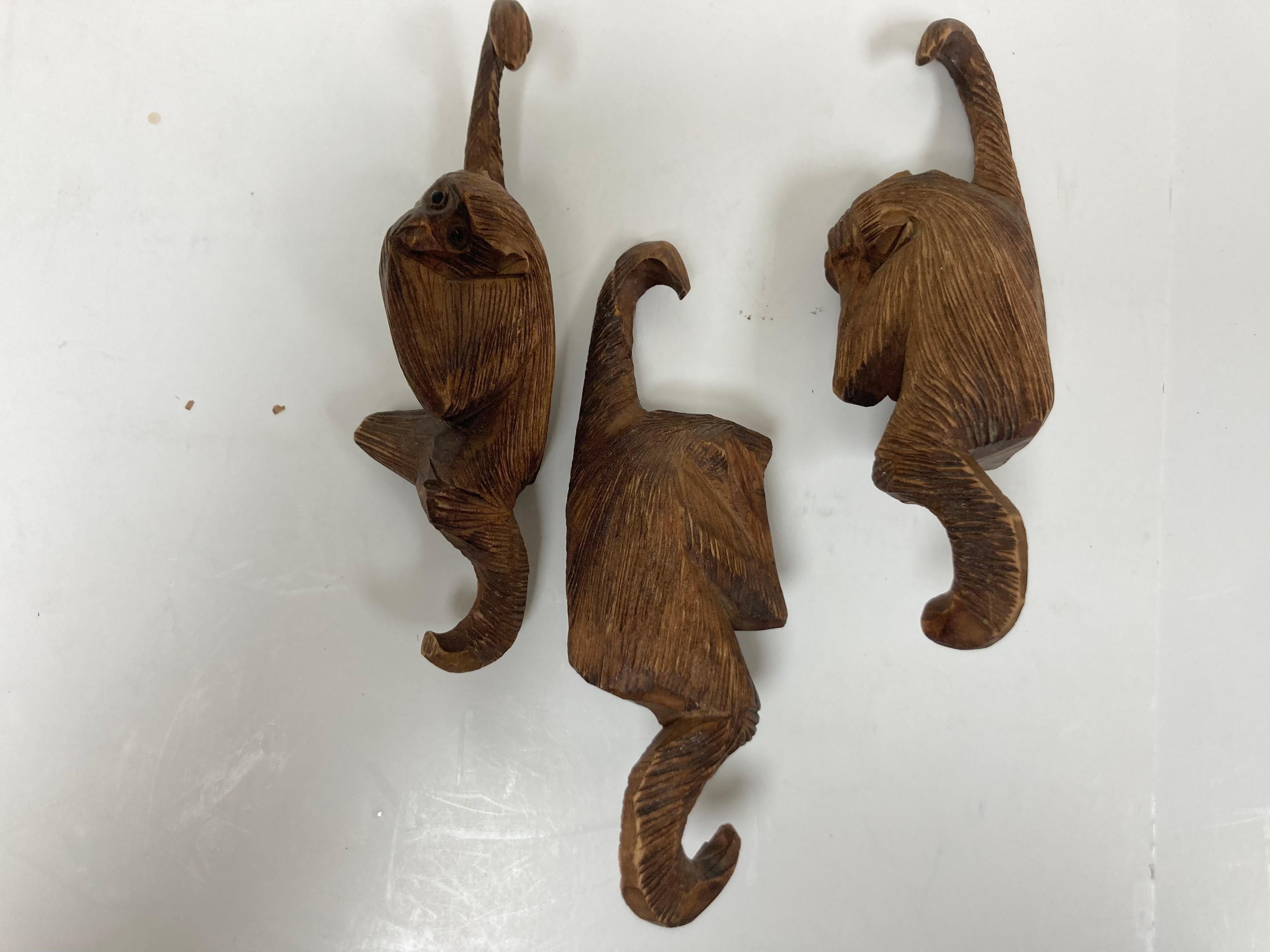 A gruppo di tre scimmie in legno dell'inizio del XX secolo, ben realizzate, nelle classiche pose di See No Evil, Speak No Evil e Hear No Evil. Usurata e morbida nella mano, ogni figura presenta incisioni meticolosamente intagliate che rappresentano la pelliccia e gli occhi di vetro scuro (la scimmia che rappresenta Speak No Evil ha un occhio mancante). Ciascuna scimmia ha un braccio e una gamba estesi e uncinati, utilizzati per collegare le tre figure per l'impiccagione, ma una perdita alla gamba della figura di See One Evil rende l'impiccagione tenue. Con l'età, le perdite e l'usura, le figure hanno assunto l'aspetto di Oggetti di studio da appendere. gestiti e visualizzati. Le dimensioni riportate di seguito si riferiscono a ciascuna figura di scimmia.