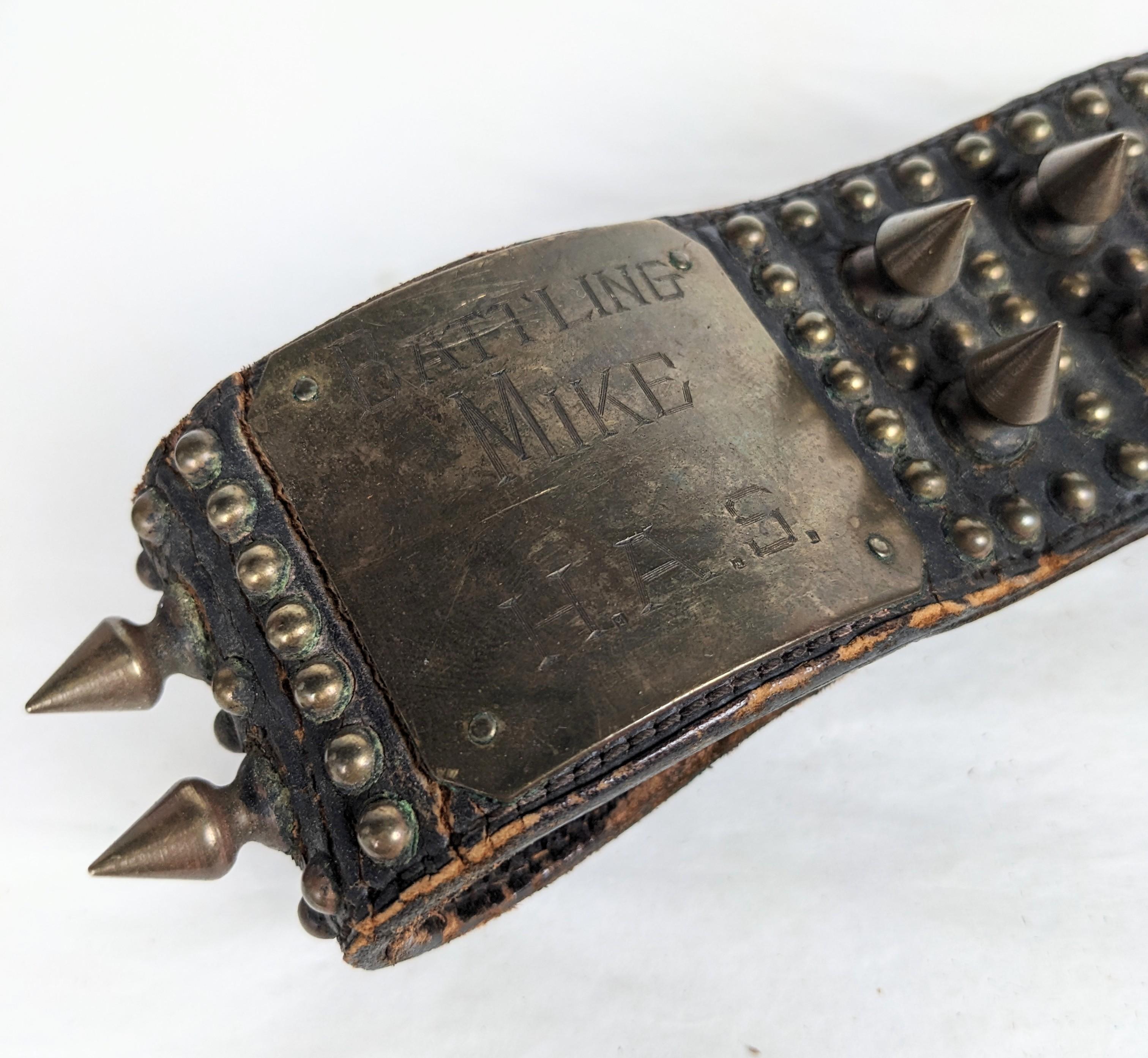 Collare per cani in pelle borchiata del XIX secolo, di origine britannica o statunitense. Pelle pesante con borchie e spuntoni avvitati dappertutto. La targhetta riporta la scritta "Battling Mike, H. H. S.". Fine del XIX secolo. 22" x 2".