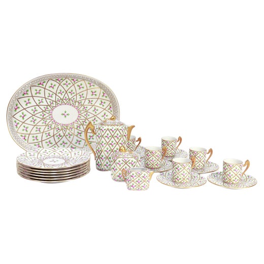 Le autentiche statuette di animali Herend - i loro raggruppamenti di conigli bianchi, gatti o fagiani - sono spesso ricoperte dalla testa ai piedi dal famoso motivo a "squama di pesce" della manifattura, noto anche come Vieux Herend, che produce l'effetto di un fitto manto di piume o pelliccia. Il motivo a scaglie di pesce compare anche su questa tazza e piattino da cioccolato decorati con il motivo Cornucopia di .